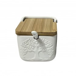WHITE SQUARE TREE SUGAR BOWL Referencia: 22110126 Medidas: 8.3x8.3x8.3 cm. Material: Bamboo Dolomite Packaging: BROWN BOX Info: 0.152778 kg. VERSA BACKSTAMP BARCODE LABEL WHITE COLOR