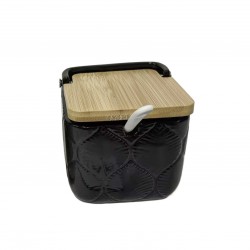 BLACK SQUARE LEAF SUGAR BOWL Referencia: 22110134 Medidas: 8.3x8.3x8.3 cm. Material: Bamboo Dolomite Packaging: BROWN BOX Info: 0.152778 kg. VERSA BACKSTAMP BARCODE LABEL BLACK COLOR