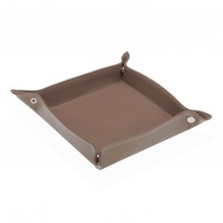 DARK BEIGE EMPTY POCKET TRAY 16CM Referencia: 22660028 Medidas: 16x16x5 cm. Material: Synthetic leather pu Packaging: VERSA BROWN BOX Info: Tray with a smooth PU finish, synthetic product