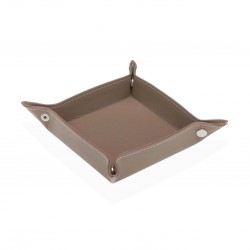 DARK BEIGE EMPTY POCKET TRAY 13CM Referencia: 22660026 Medidas: 13x13x3.3 cm. Material: Synthetic leather pu Packaging: VERSA BROWN BOX Info: Tray with a smooth PU finish, synthetic product