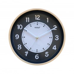 Plastic wall clock with wood effect.