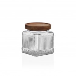 BOROSILICATE JAR ACACIA LID 370ML Referencia: 22500109 Medidas: 8x8x9 cm. Material: Glass Packaging: BROWN BOX Info: 6pcs/brown box high borosilicate glass with acaia lid and spoon versa handtag