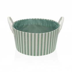 GREEN STRIPED ROUND BASKET Referencia: 22950026 Medidas: 30x30x15 cm. Material: Cotton Polyester PVC Packaging: Info: PVC handles 80% polyester 20% cotton