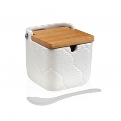 WHITE SQUARE LEAF SUGAR BOWL Referencia: 22110132 Medidas: 8.3x8.3x8.3 cm. Material: Bamboo Dolomite Packaging: BROWN BOX Info: 0.152778 kg. VERSA BACKSTAMP BARCODE LABEL WHITE COLOR