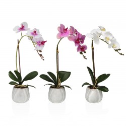 POTTED ASSORTED ORCHID FLOWER Referencia: 20180003 Medidas: 9x10x40 cm. Material: Cement Plastic Packaging: BROWN BOX Info: Plastic orchid in cement pot Assorted in 3 colours of orchids