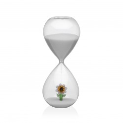 FLOWER SAND TIMER 30MIN Referencia: 22190009 Medidas: 8x8x20 cm. Material: Glass Packaging: POLYBAG Info: Borosilicate glass and sand
