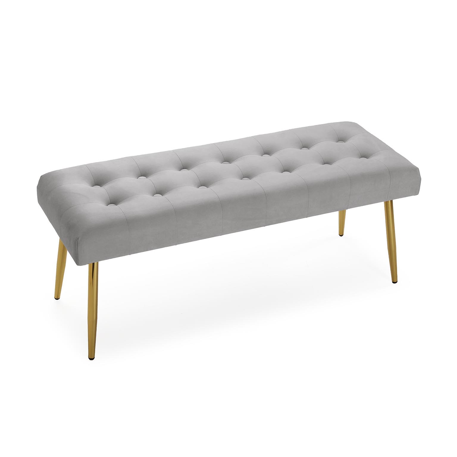 Crafted from durable MDF wood and metal, this bench features a soft polyester upholstery in a sophisticated grey tone, complemented by elegantly finished gold legs.