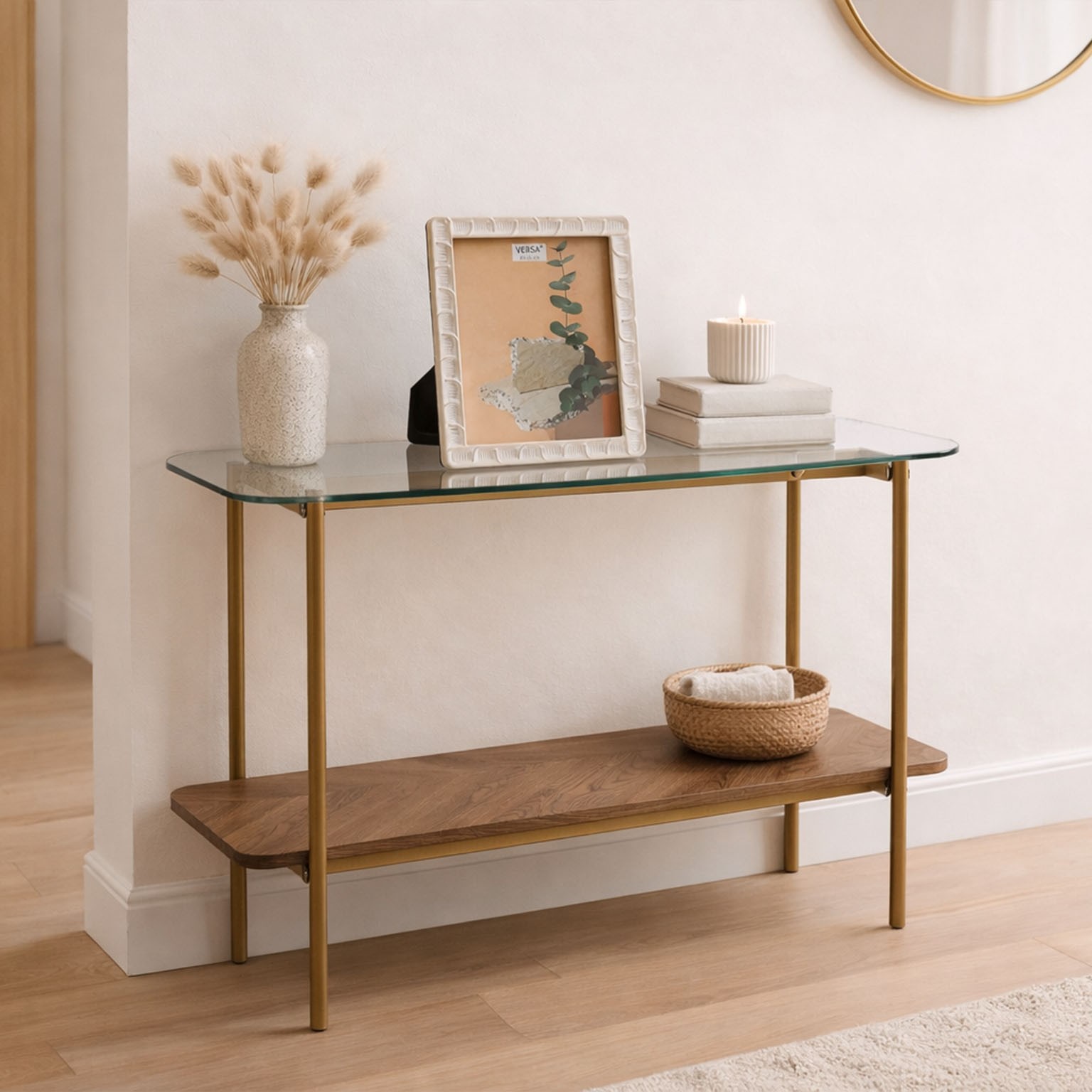 Crafted with an 8 mm tempered glass top, a 15 mm wooden lower shelf, and a robust metal frame, this industrial-style console table balances functionality and aesthetic appeal.