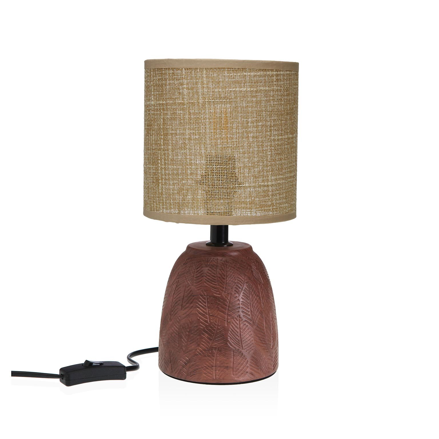 Crafted from durable ceramic with a textured dark brown finish, it features a light beige fabric shade that diffuses warm light beautifully.