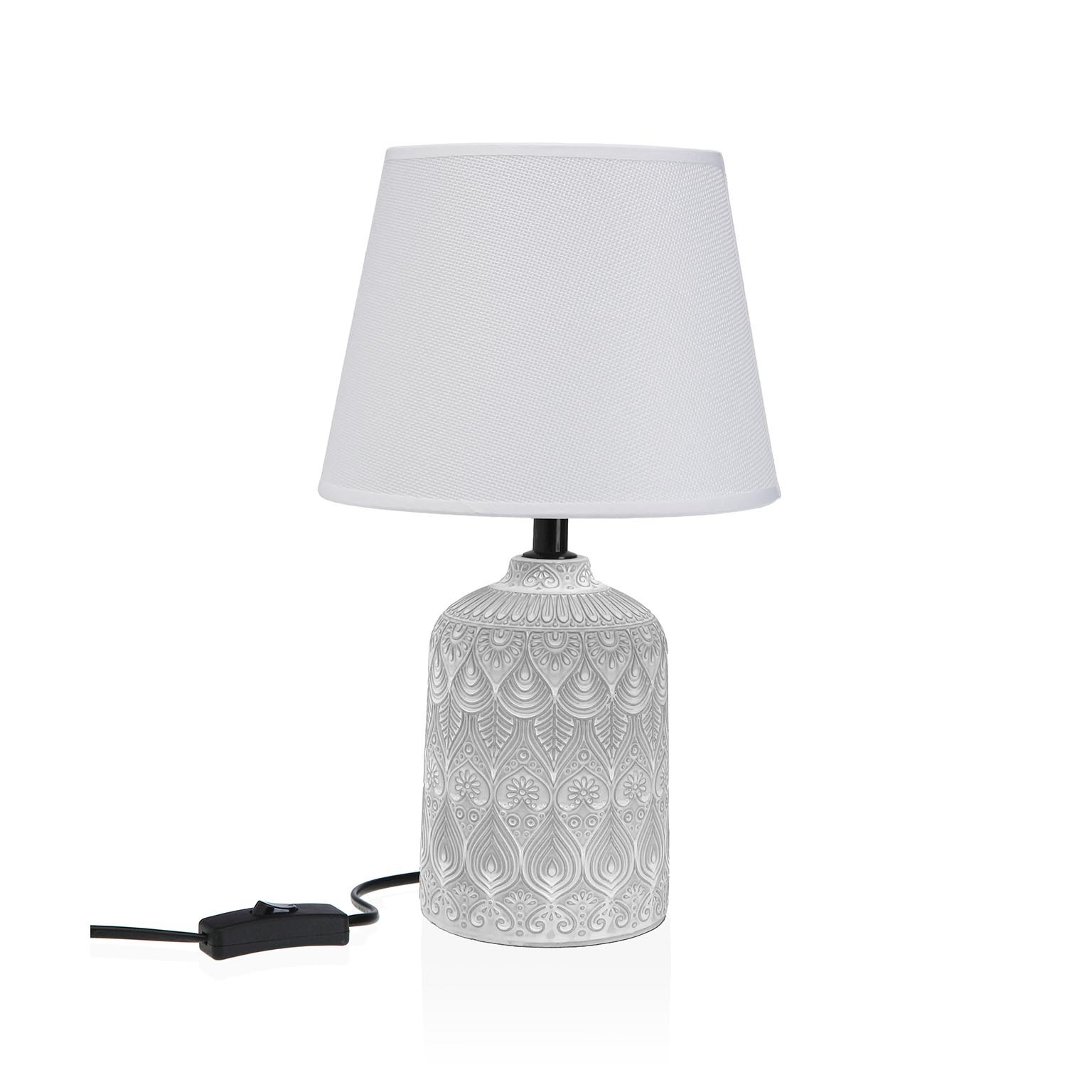 Crafted from ceramic with a textured fabric shade, this lamp stands at 34 cm tall and features a base measuring 13,5x13,5x28 cm.
