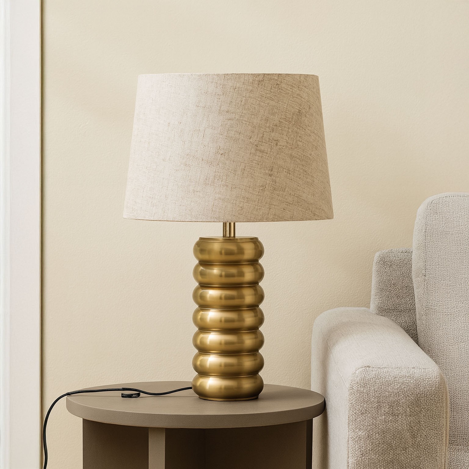 The elegant beige textile shade (9x9x8 cm) diffuses light beautifully, making it suitable for living rooms, bedrooms, or home offices.