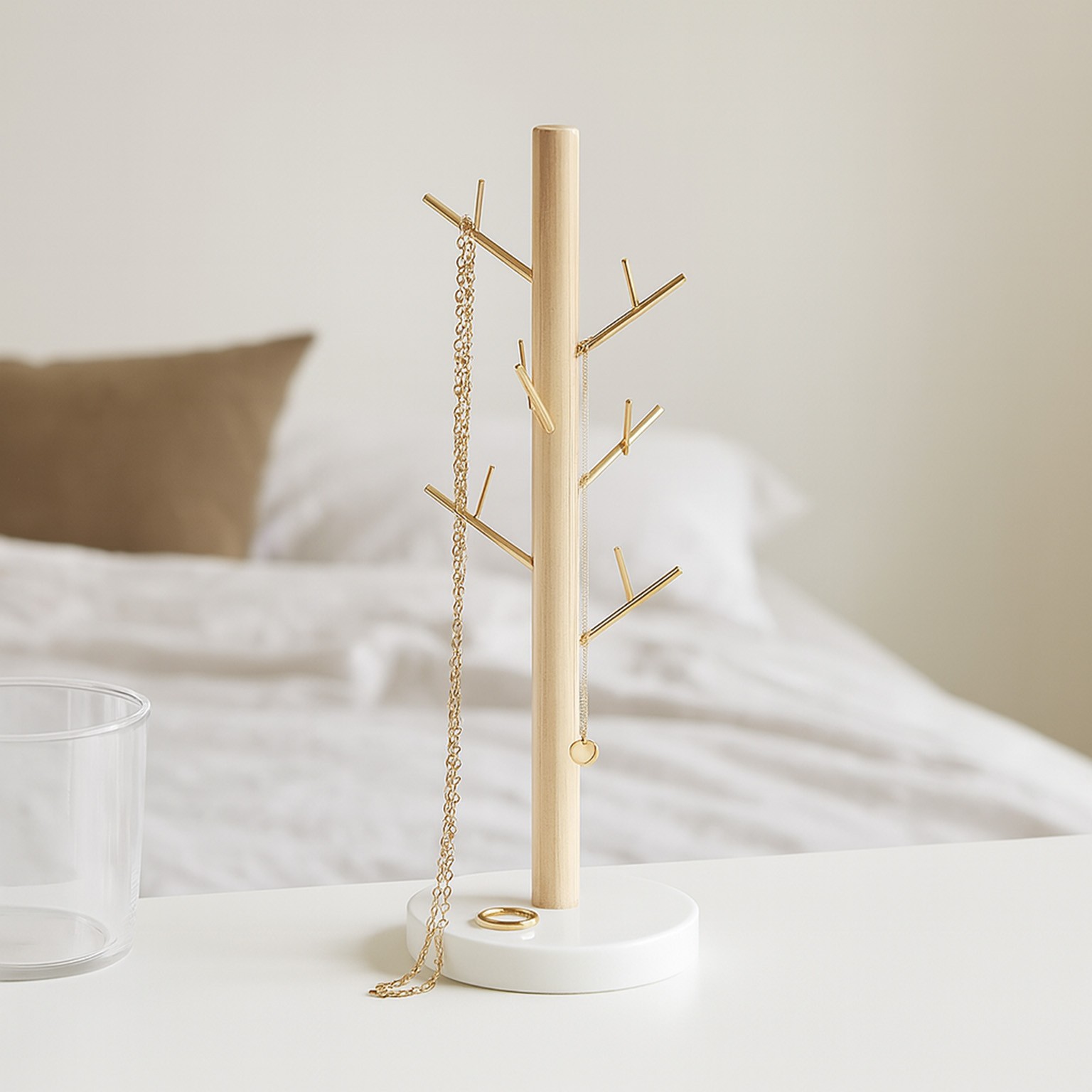 Standing at 27 cm tall, this elegant organiser features a sturdy wooden pole and a gold metal tree structure, perfect for displaying necklaces, bracelets, and rings.