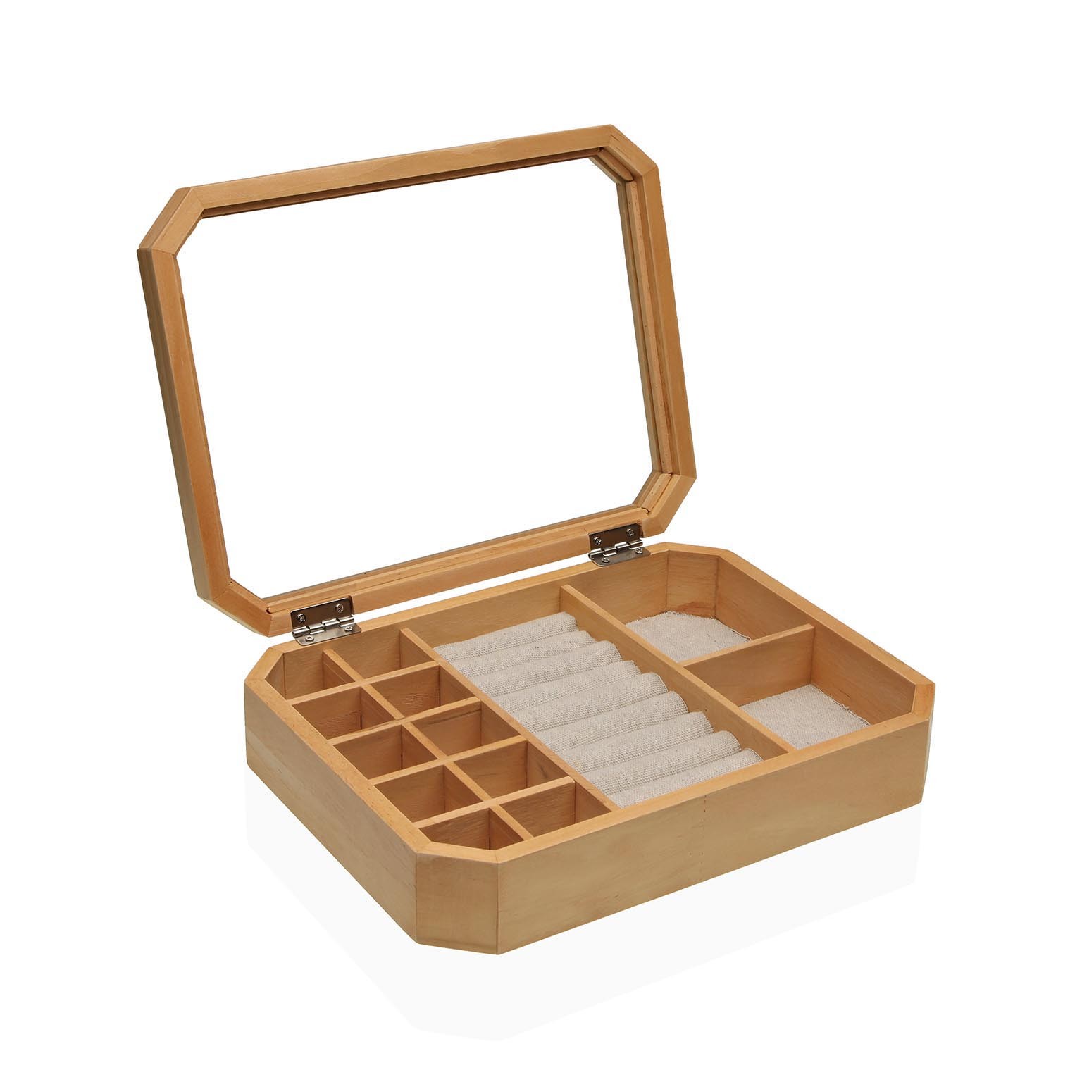 Crafted from a blend of MDF wood, pine wood, and linen, this organiser features a glass top for easy visibility and a soft velvet-lined interior.