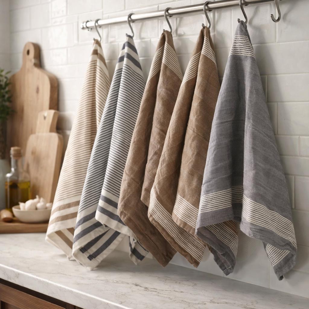 Crafted from durable cotton, these towels feature neutral tones of beige, brown, and gray, accented with subtle stripes, making them a versatile addition to any kitchen decor.