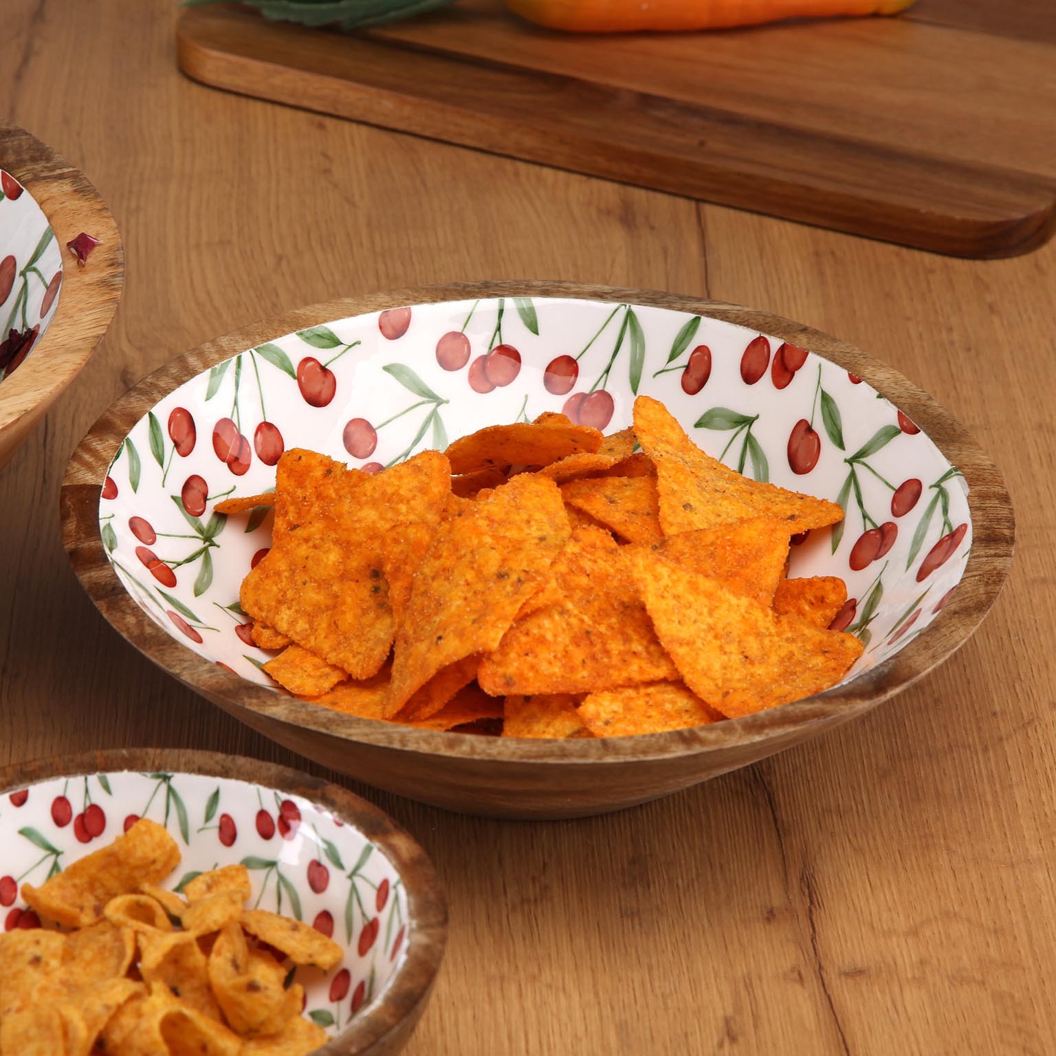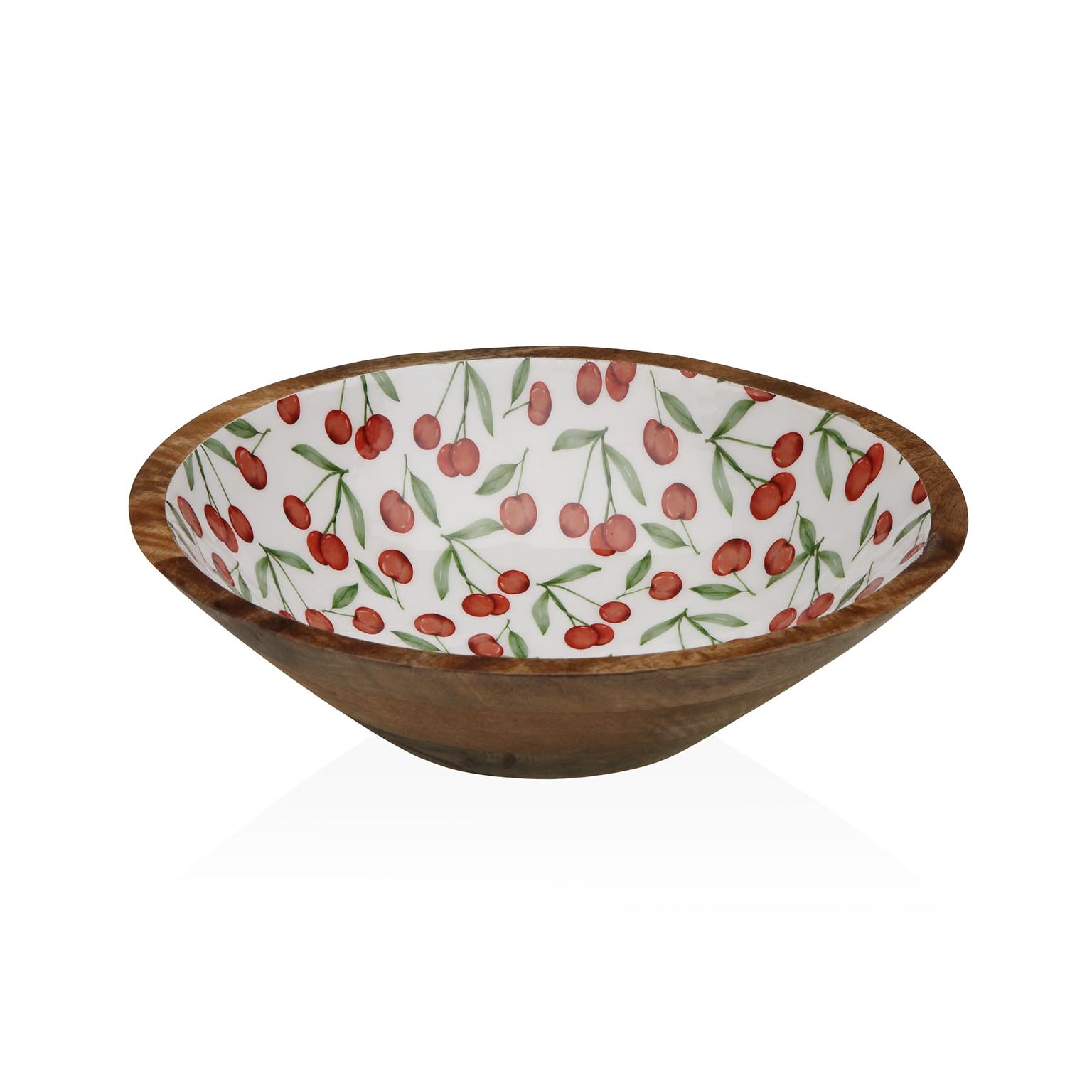 Enhance kitchen presentations with the Large Cherries Enamelled Bowl, crafted from durable mango wood and featuring a vibrant cherry- patterned porcelain interior.