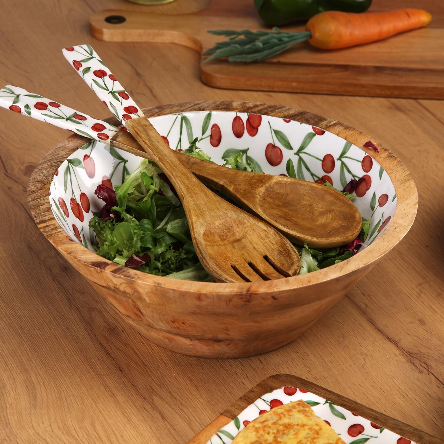 Elevate kitchen aesthetics with the Cherries Utensil Set, crafted from durable mango wood and adorned with vibrant porcelain handles featuring playful cherry motifs.