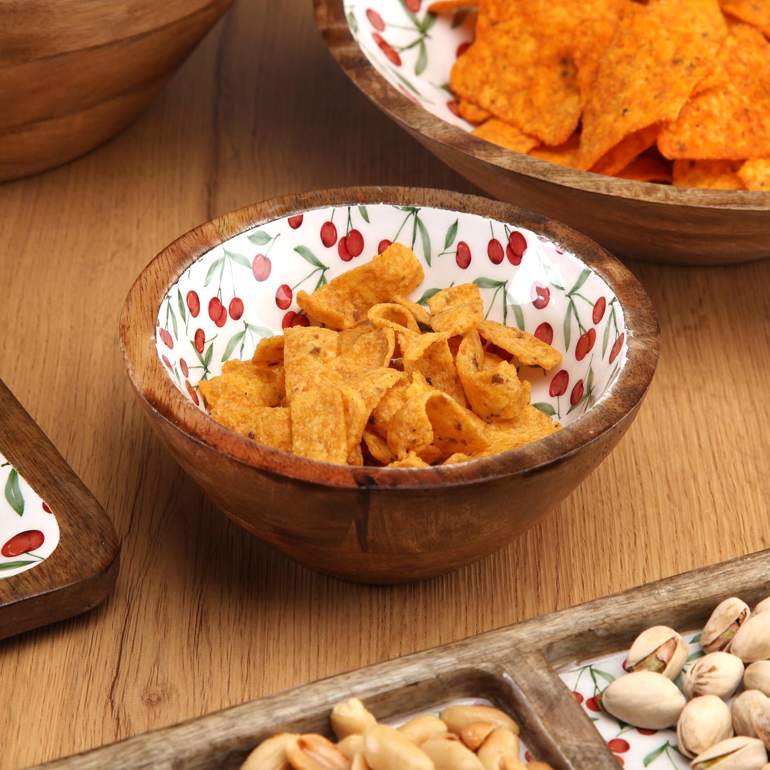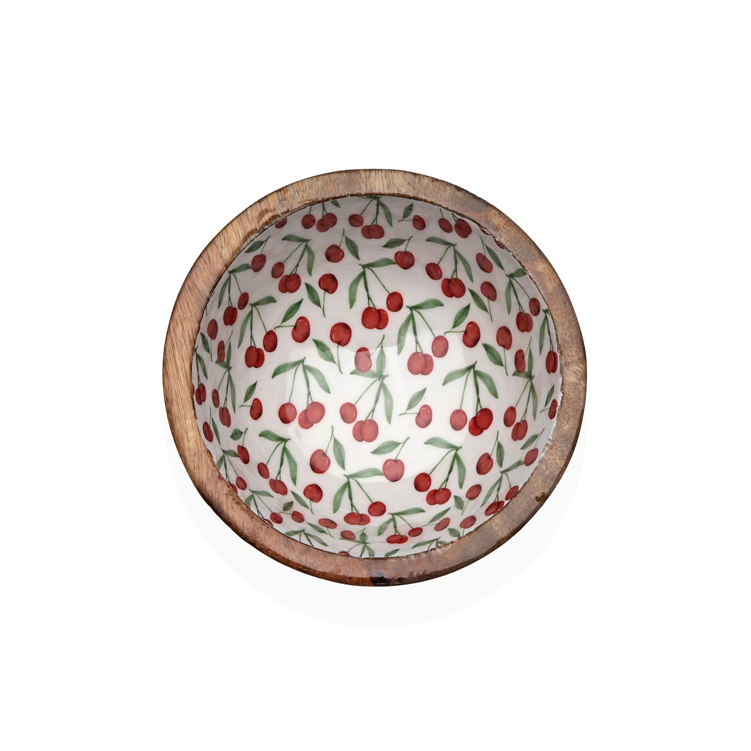 Crafted from durable mango wood, this bowl features an enchanting cherry-patterned enamel interior, perfect for serving salads, fruits, or snacks.