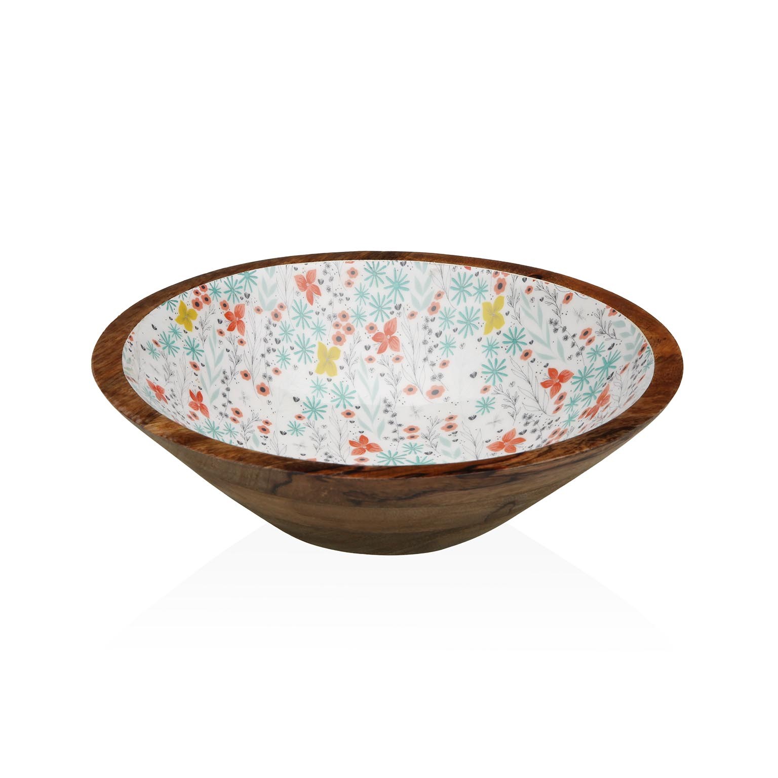 Crafted from durable mango wood with a vibrant enamelled interior, this bowl features a stunning floral design in bright hues of white, green, yellow, and red.