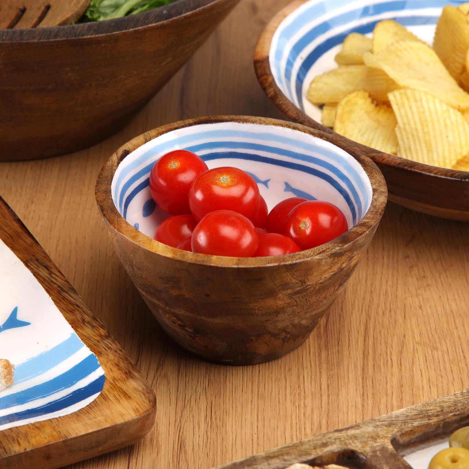Crafted from sustainable mango wood, this bowl features a beautifully enamelled interior adorned with charming fish patterns in blue, evoking a coastal vibe.