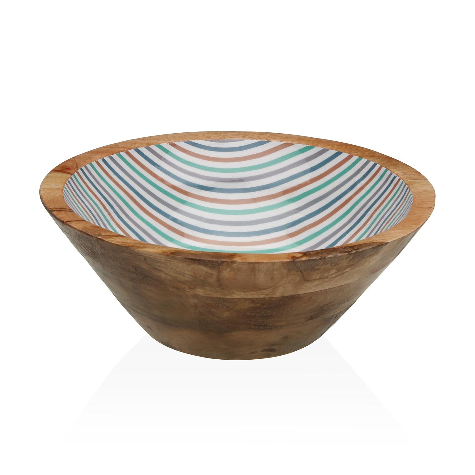 Crafted from durable mango wood, this 30cm diameter serving bowl features a beautifully painted interior adorned with a playful striped pattern in shades of blue, green, and terracotta.