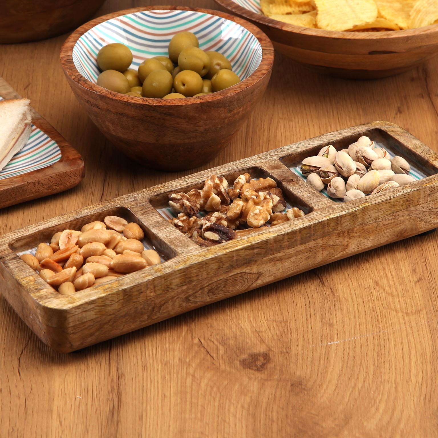 Introducing the Stripes Three-Compartment Platter, crafted from durable mango wood, this platter combines functionality with rustic charm.
