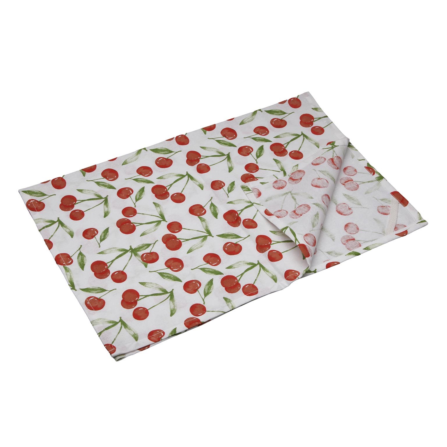 Crafted from durable cotton, this towel features a charming design of vibrant red cherries and lush green leaves against a crisp white background, embodying a rustic or Mediterranean aesthetic.