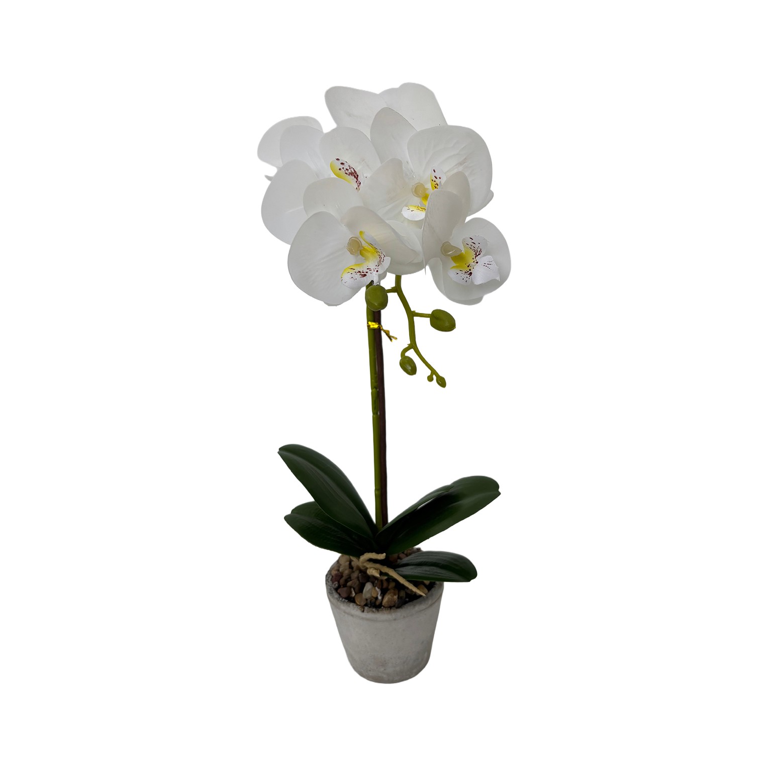 Enhance any space with the Orchid Flower Set of 3 with Pot, featuring three elegantly crafted artificial orchids in a minimalist cement pot.