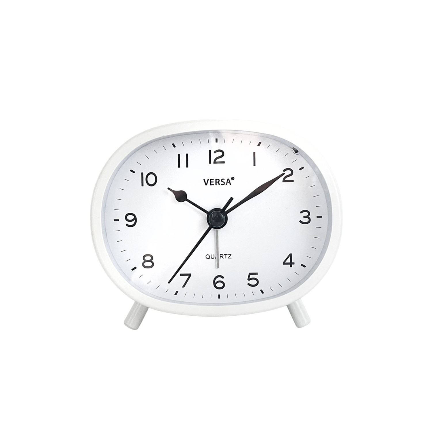 Crafted from durable plastic with a sleek glass face, this alarm clock features striking black numbers and elegant metal hands for easy readability.