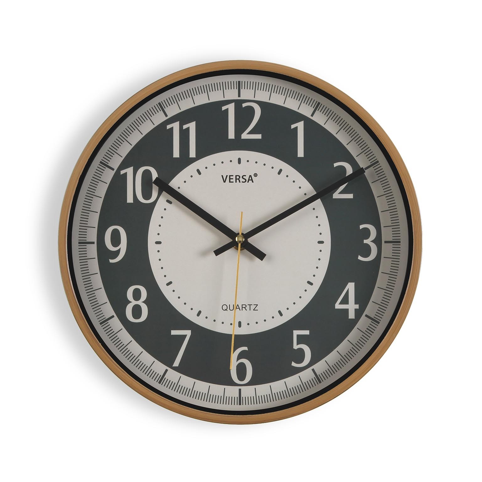Crafted from durable plastic with a sleek glass face, it features white numbering and hands against a stylish grey backdrop, complemented by a gold casing.