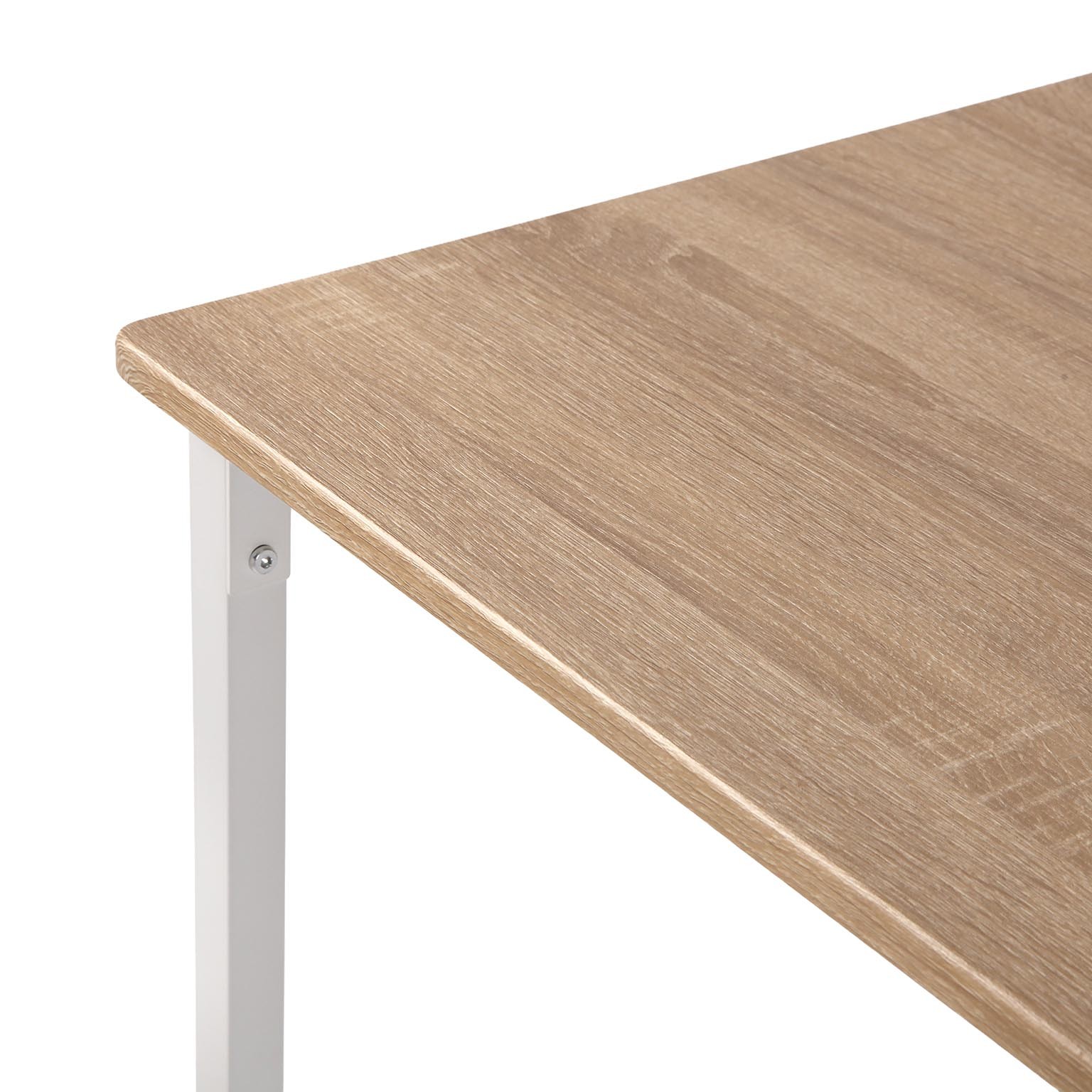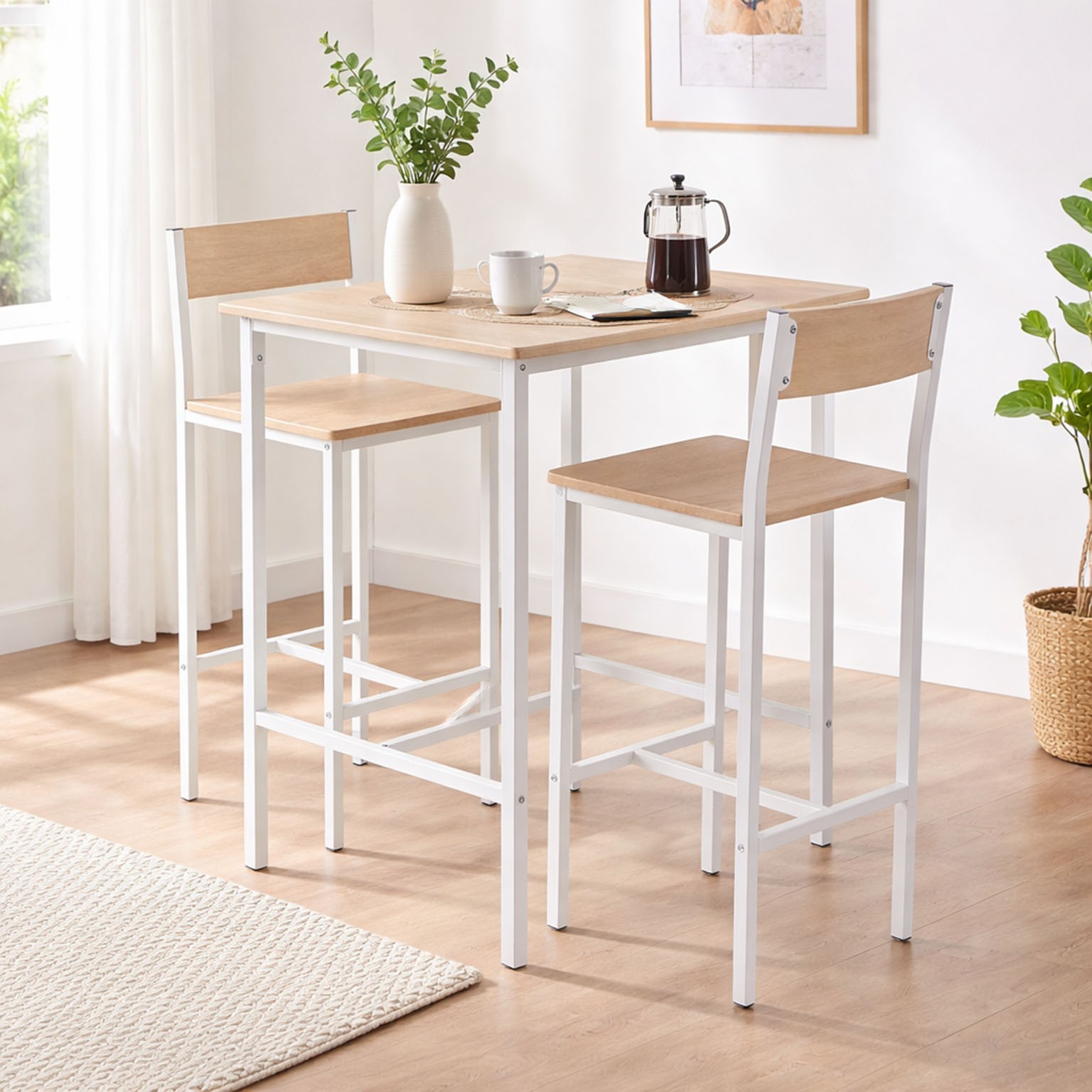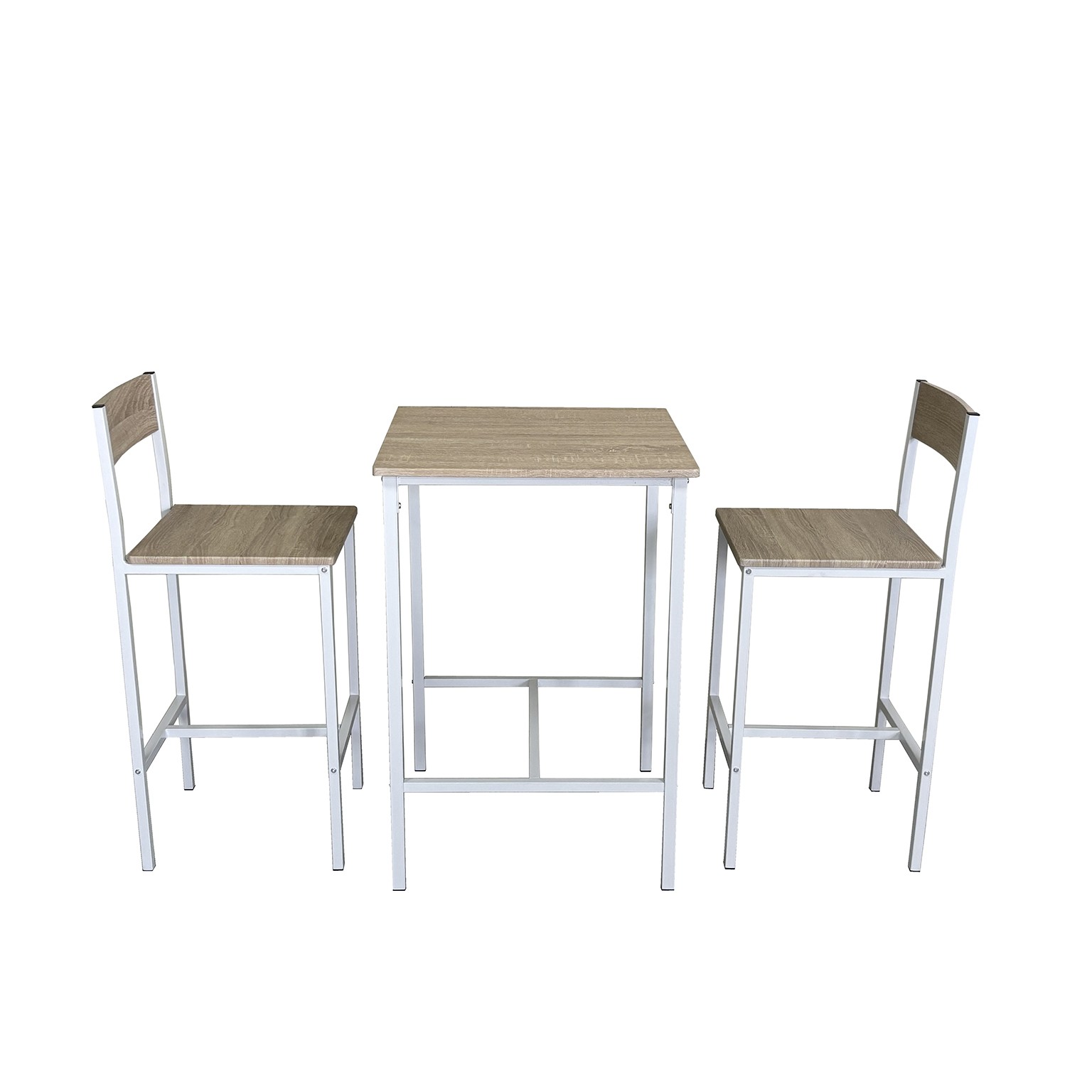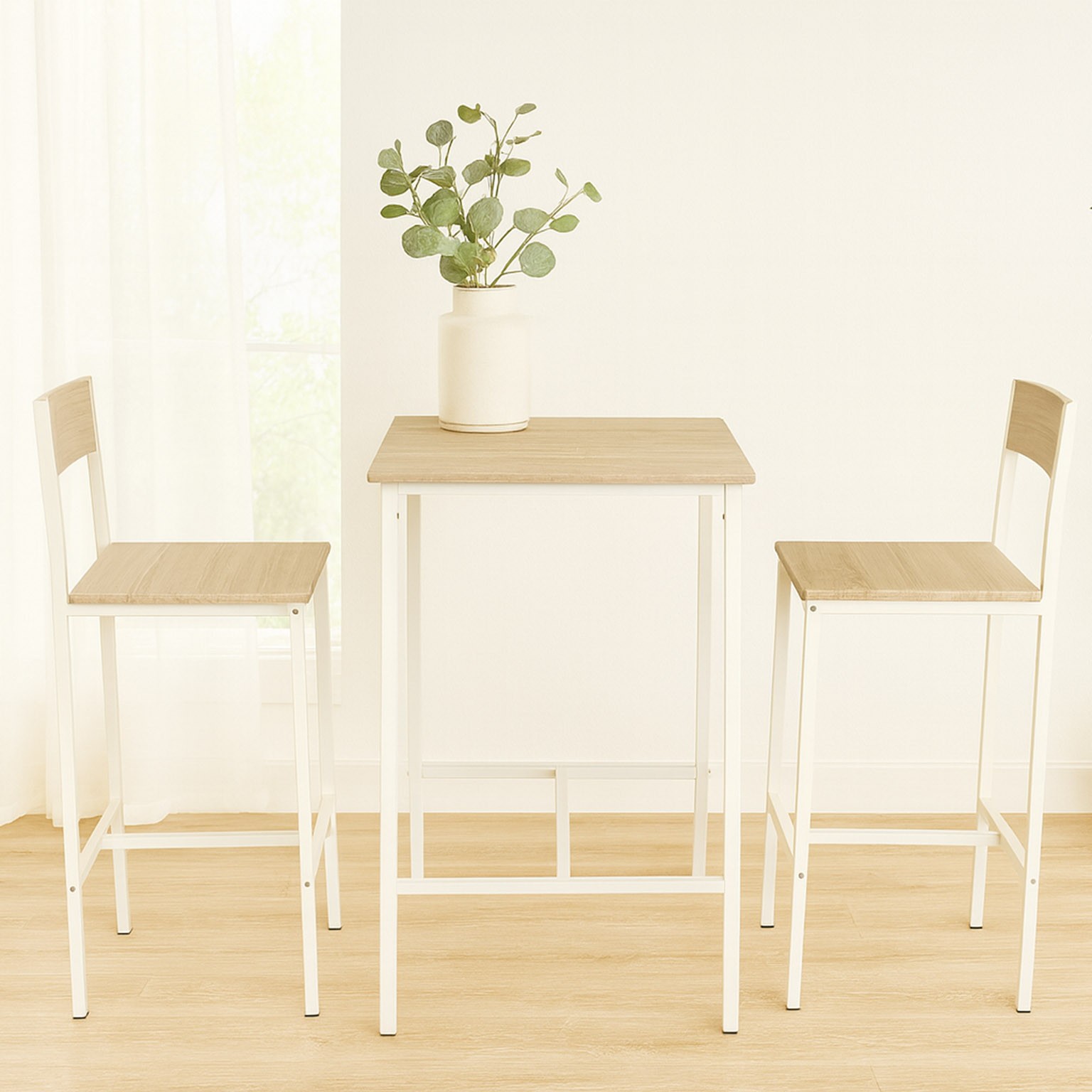 Crafted from durable MDF wood and a sturdy metal frame, this set features a sleek light wood tabletop complemented by a white metal base.