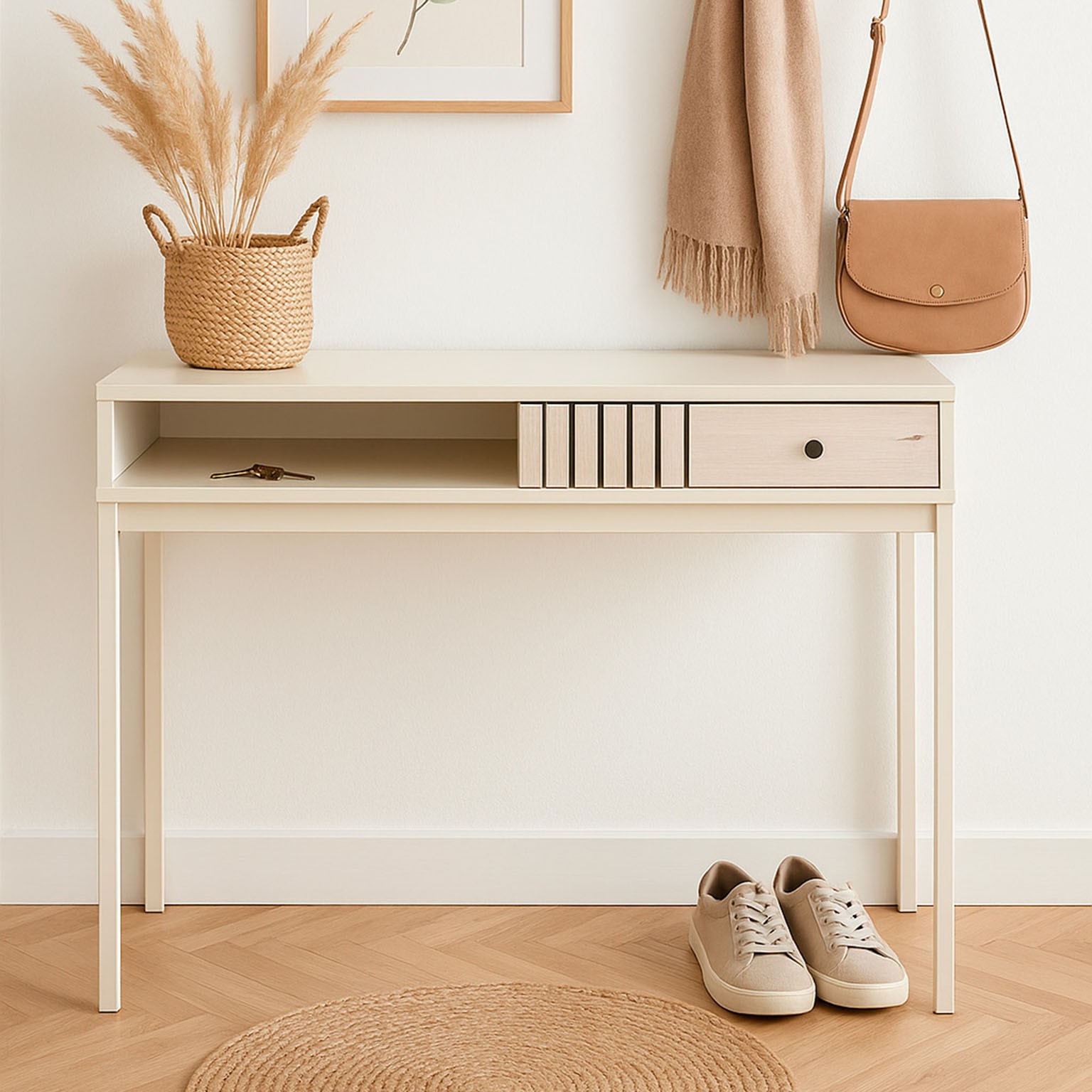 Ideal for entryways or hallways, it serves as a functional surface for keys, mail, or decorative items, seamlessly blending with various decor styles in both residential and light commercial settings.