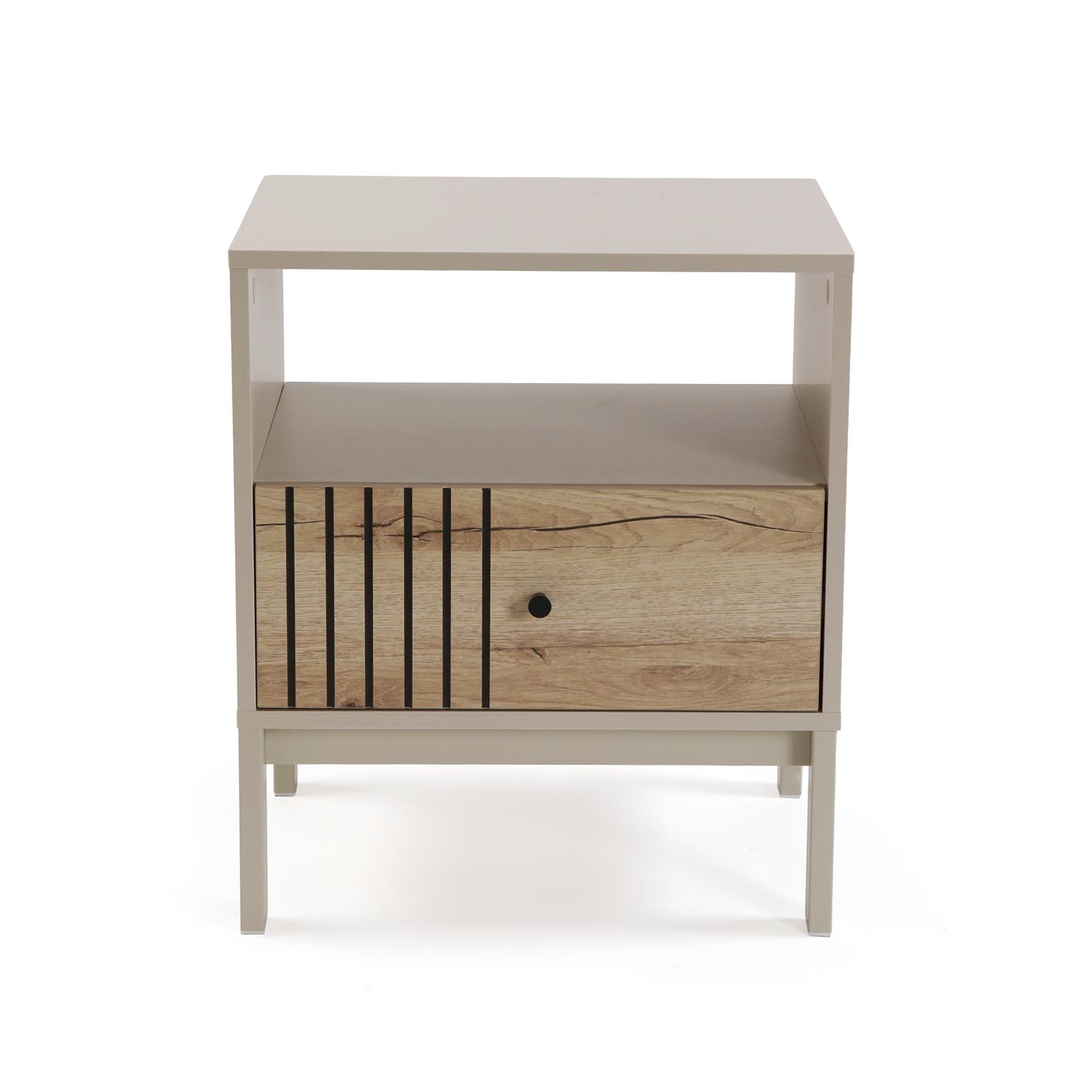 Crafted from durable MDF wood and melamine, this side table features a light beige body with a natural wood veneer drawer front.