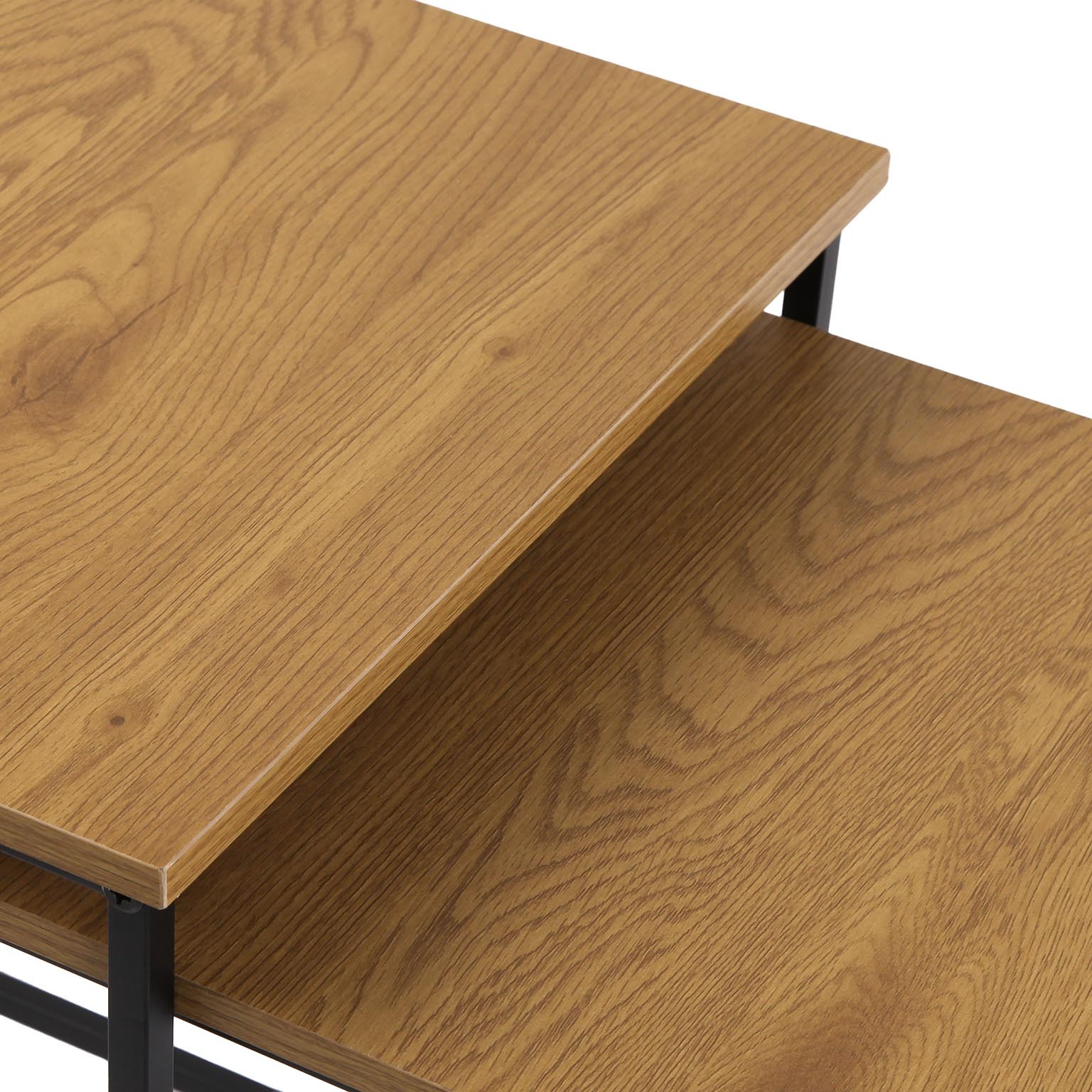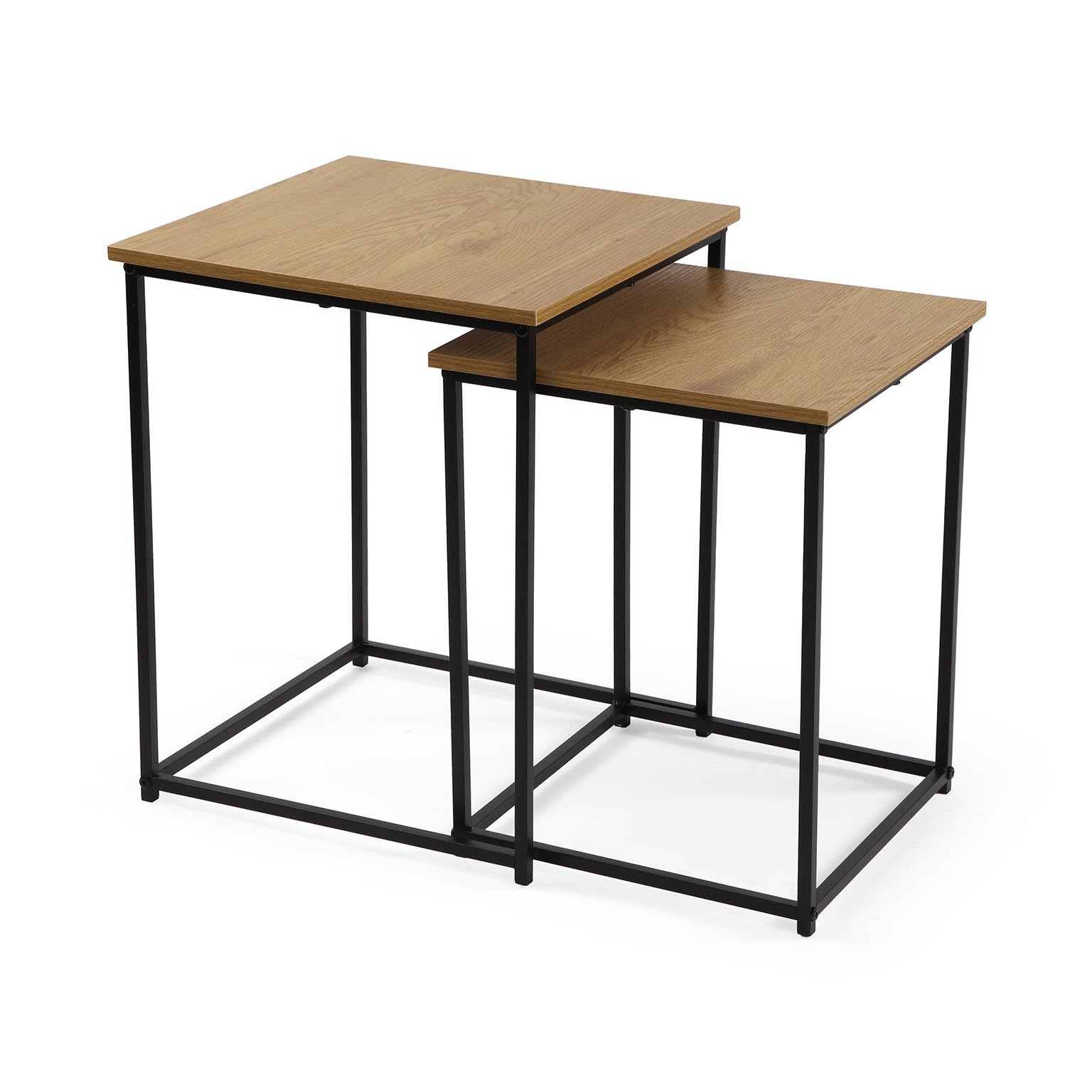 This set includes two nesting tables, crafted with a durable metal frame and a light wood-tone tabletop, perfect for enhancing living rooms or lounges.