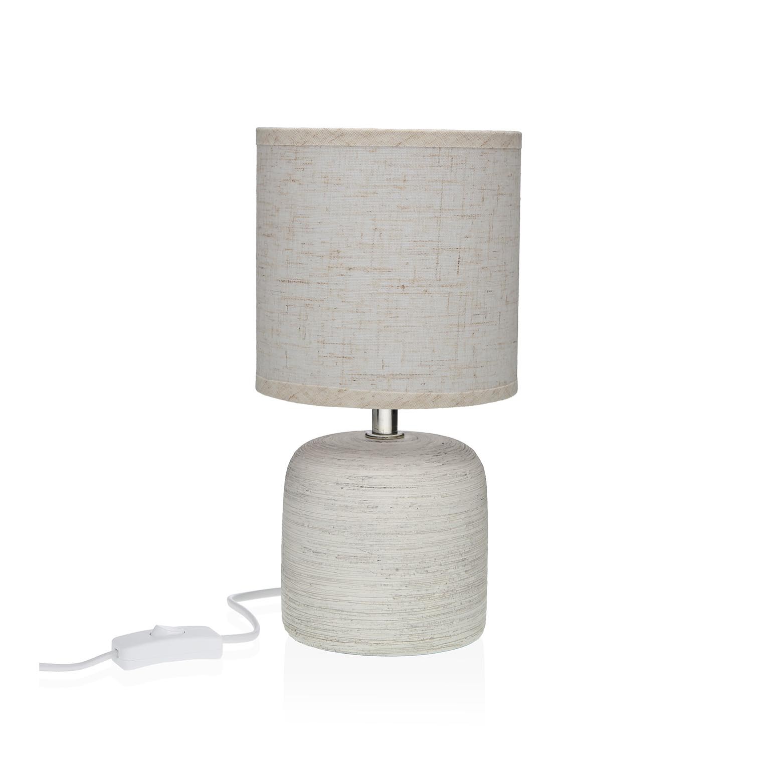 Standing at 25,5 cm tall, this lamp features a sleek grey ceramic base complemented by a light beige fabric shade, measuring 15x15x15 cm.