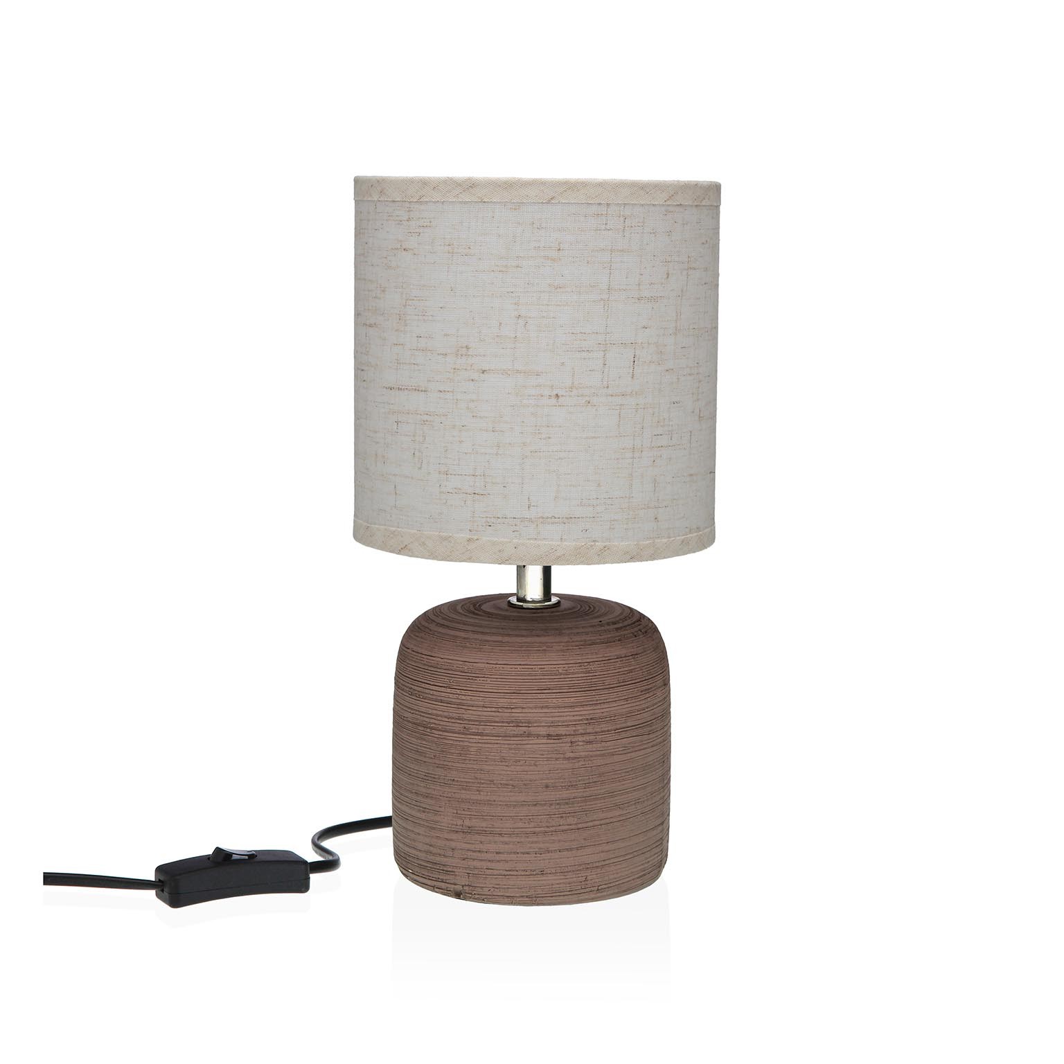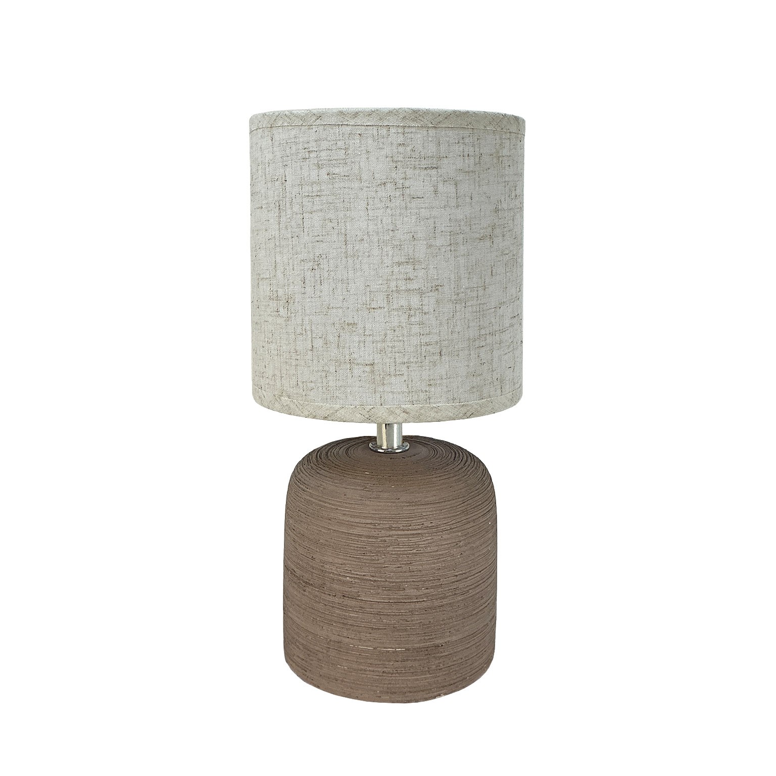Crafted from durable ceramic, its brave brown base complements a light fabric shade, creating a harmonious balance.