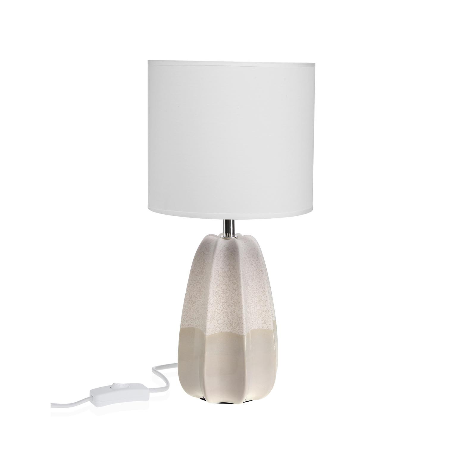 Crafted with a ceramic base in a light beige tone, it features a soft white fabric shade that diffuses light beautifully.