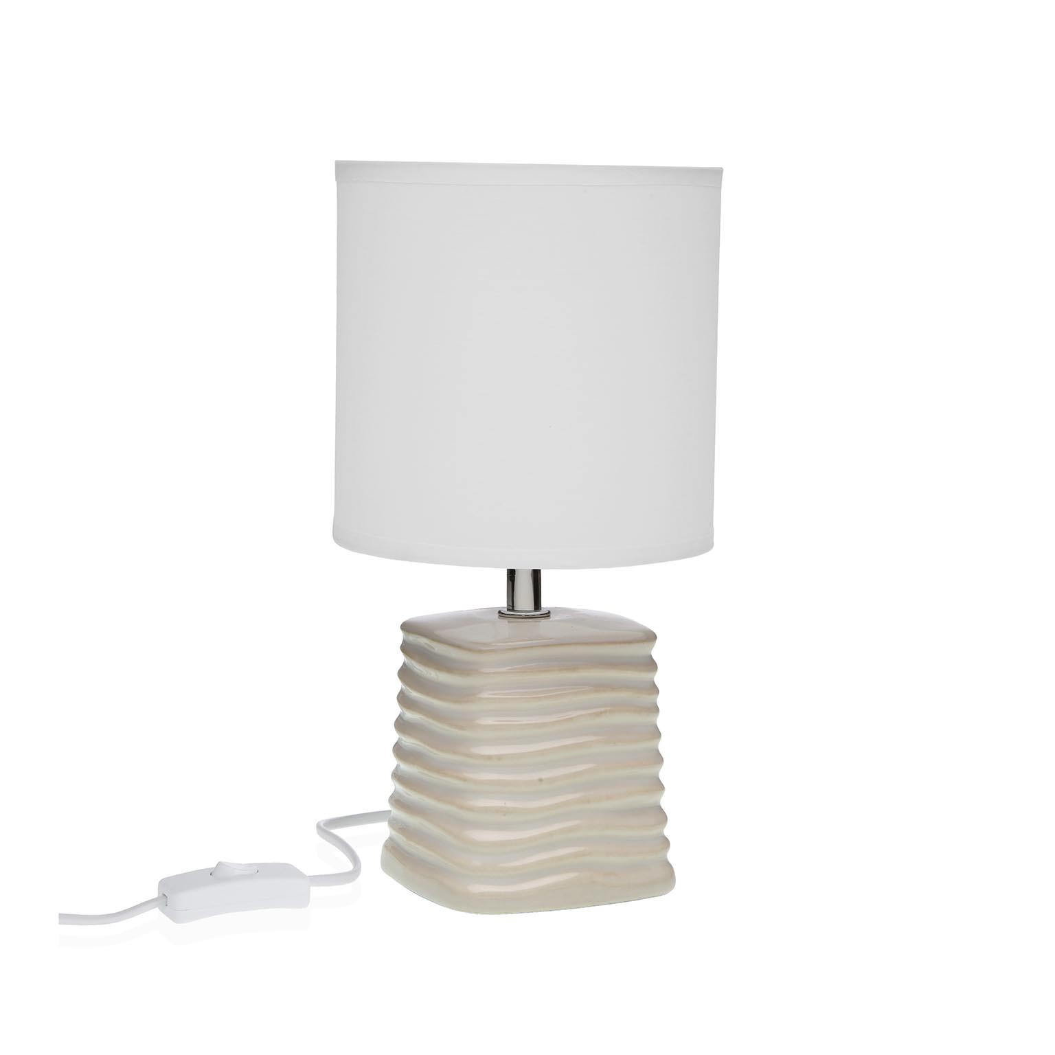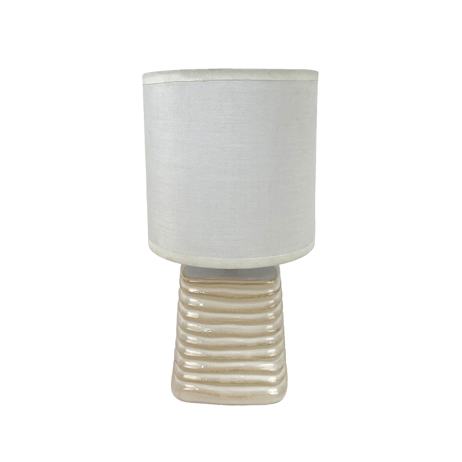 Crafted from ceramic with a sleek, glossy finish, its minimalist design features a fabric shade that diffuses light softly, creating a warm ambiance.