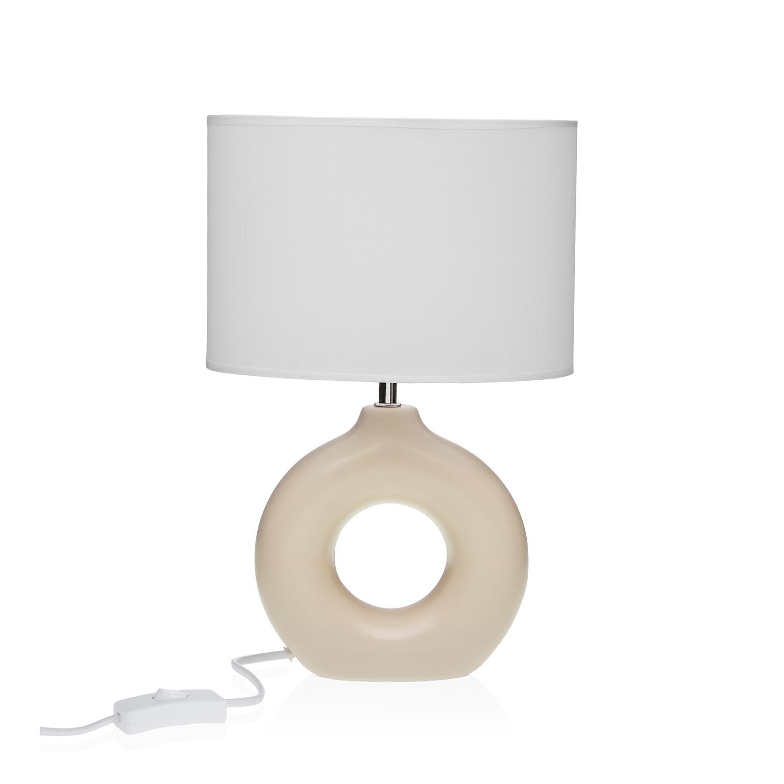 Featuring a sleek ceramic base in neutral tones and a crisp white fabric shade, this lamp stands at 18 cm high, with a width of 20 cm and a length of 26 cm.