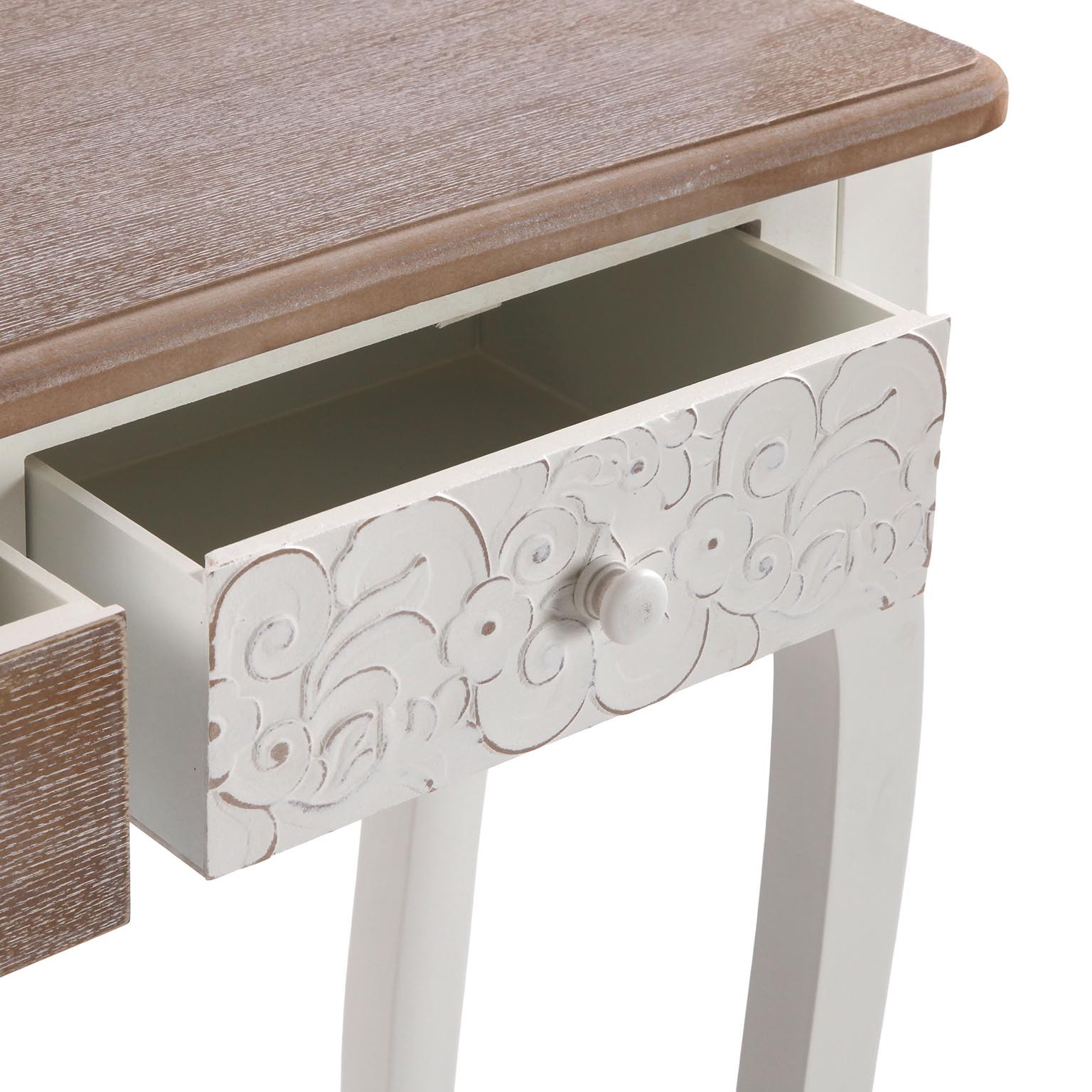 Its charming rustic design features a white body with natural wood accents, making it a versatile piece for hallways or living areas.