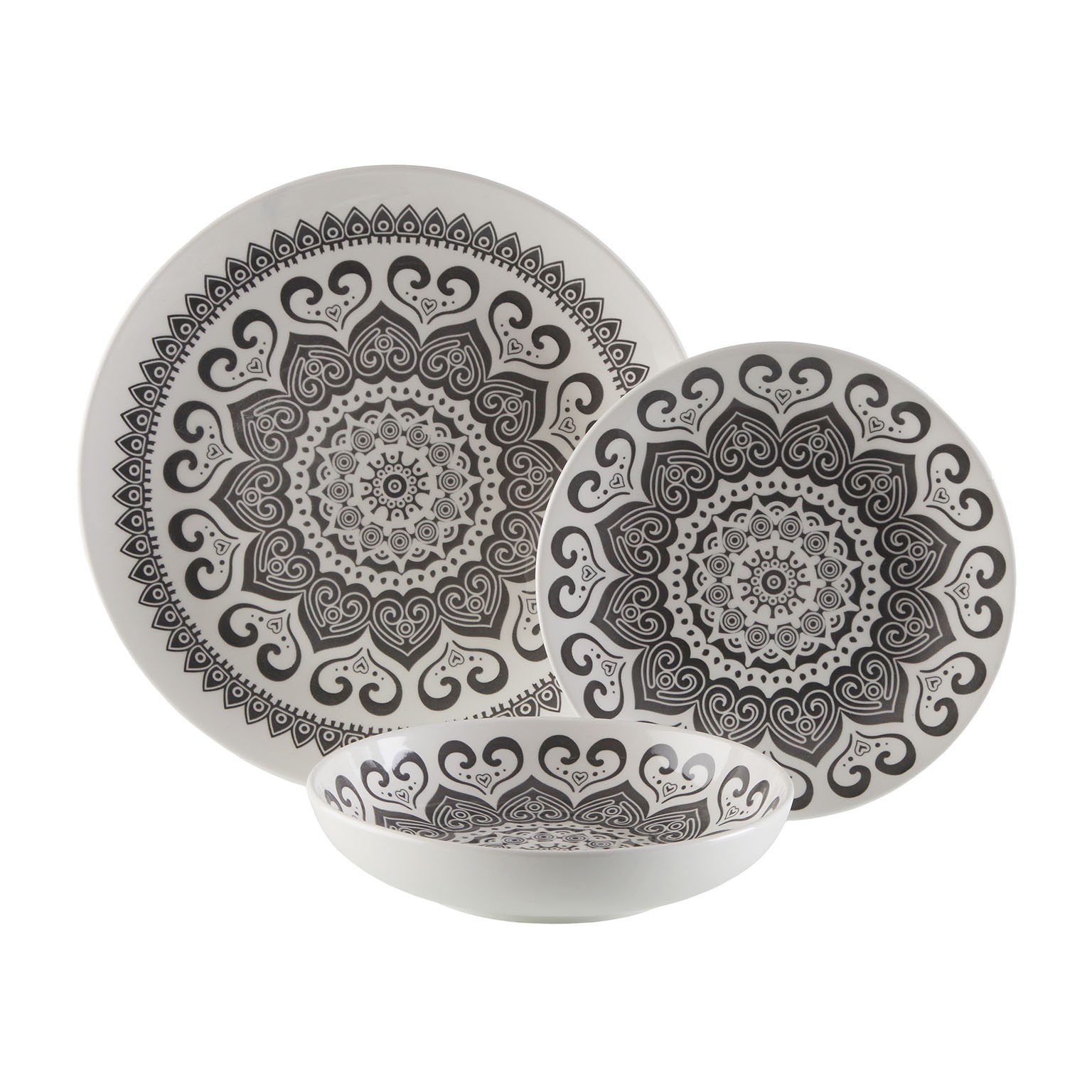 This set includes six flat plates (26,5 cm), six deep plates (20 cm), and six dessert plates (19 cm), making it versatile for various culinary presentations.