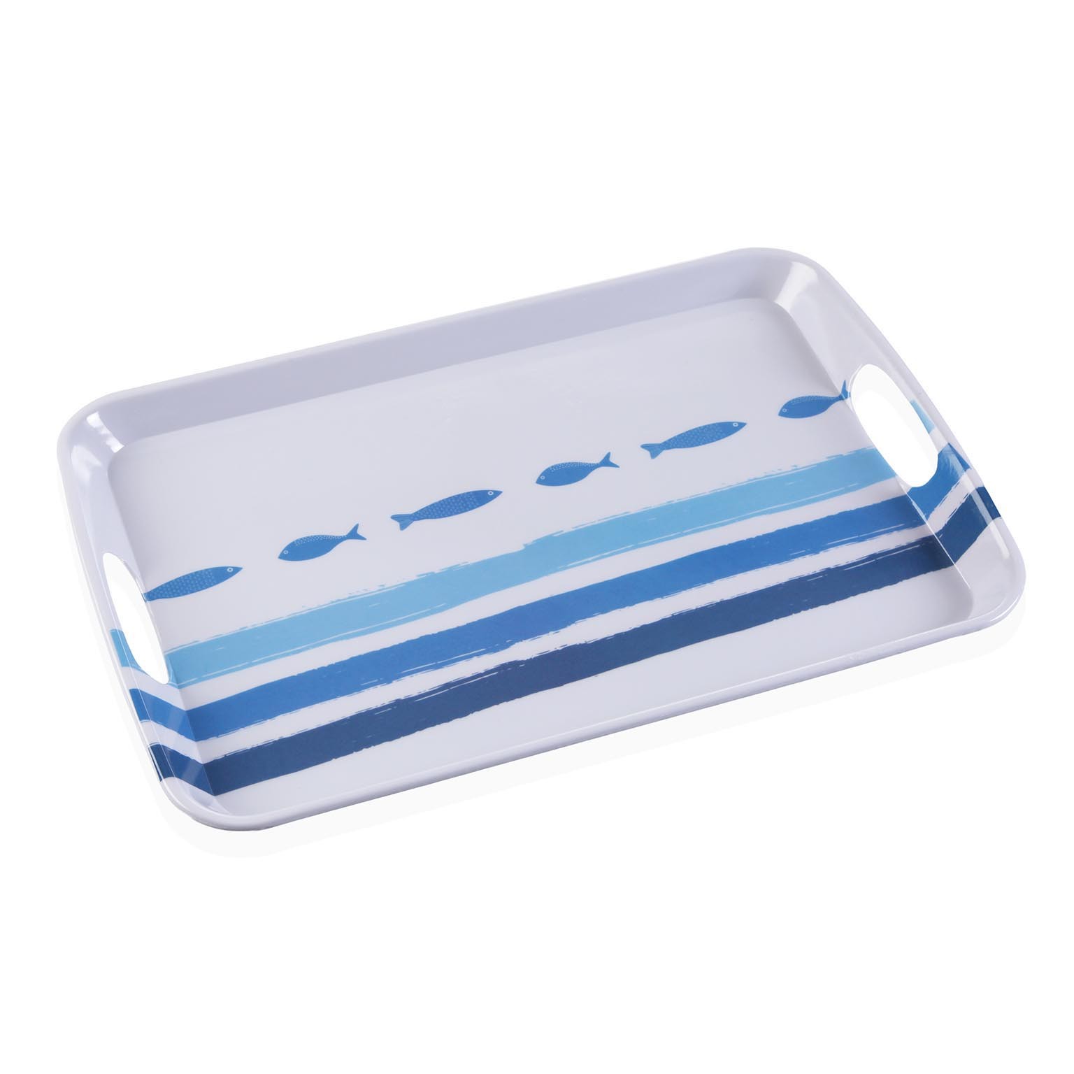 Measuring 31 cm in width, 46,2 cm in length, and 3 cm in height, this serving platter features a captivating Mediterranean design in soothing shades of blue and white.