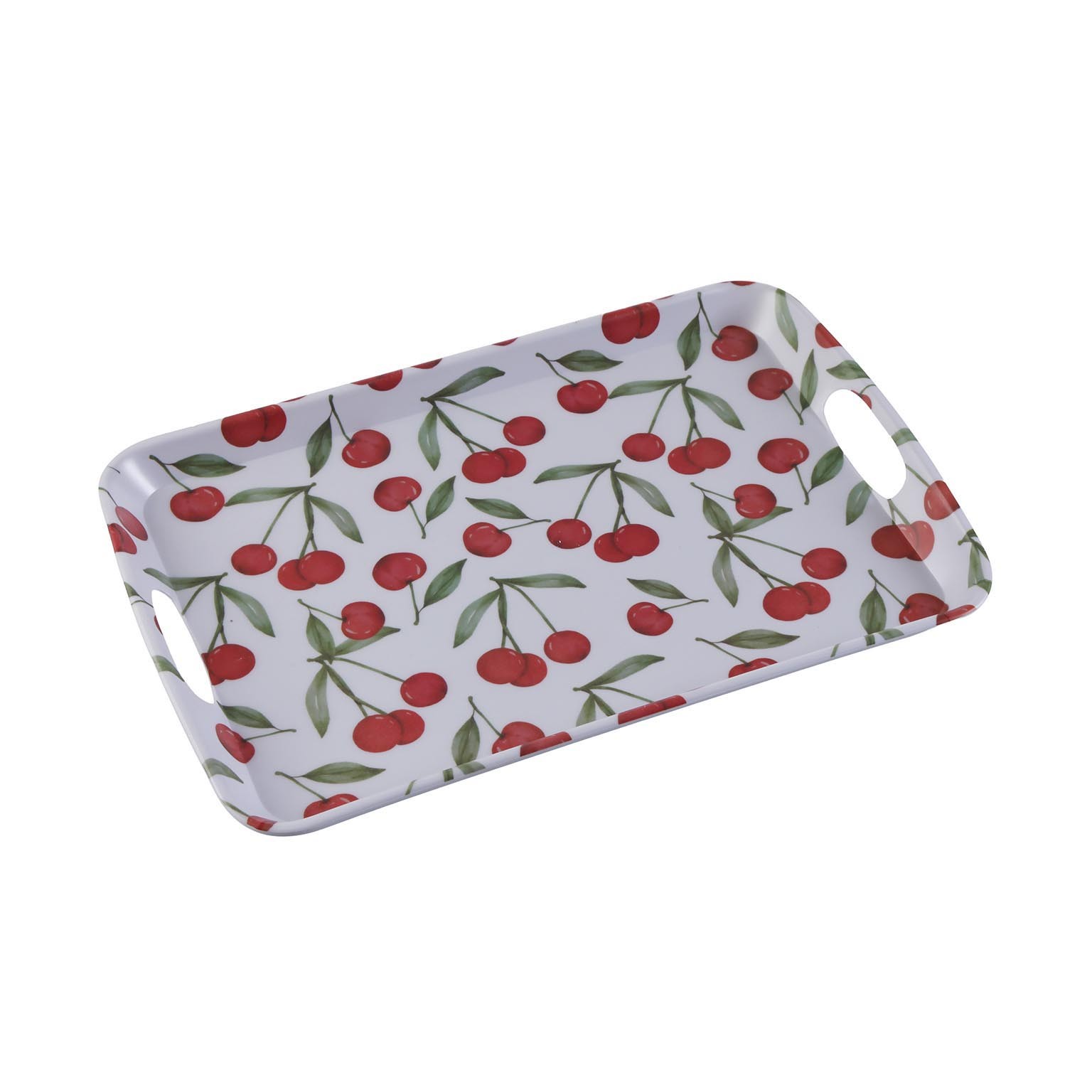 Its cheerful design features a white base adorned with vibrant red cherries and green leaves, making it perfect for serving snacks, appetizers, or desserts.