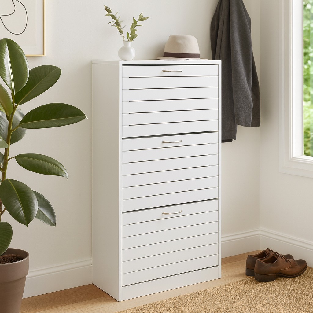 Introducing the White Shoe Cabinet with 3 Drawers, a modern minimalist storage solution crafted from durable MDF wood and melamine.