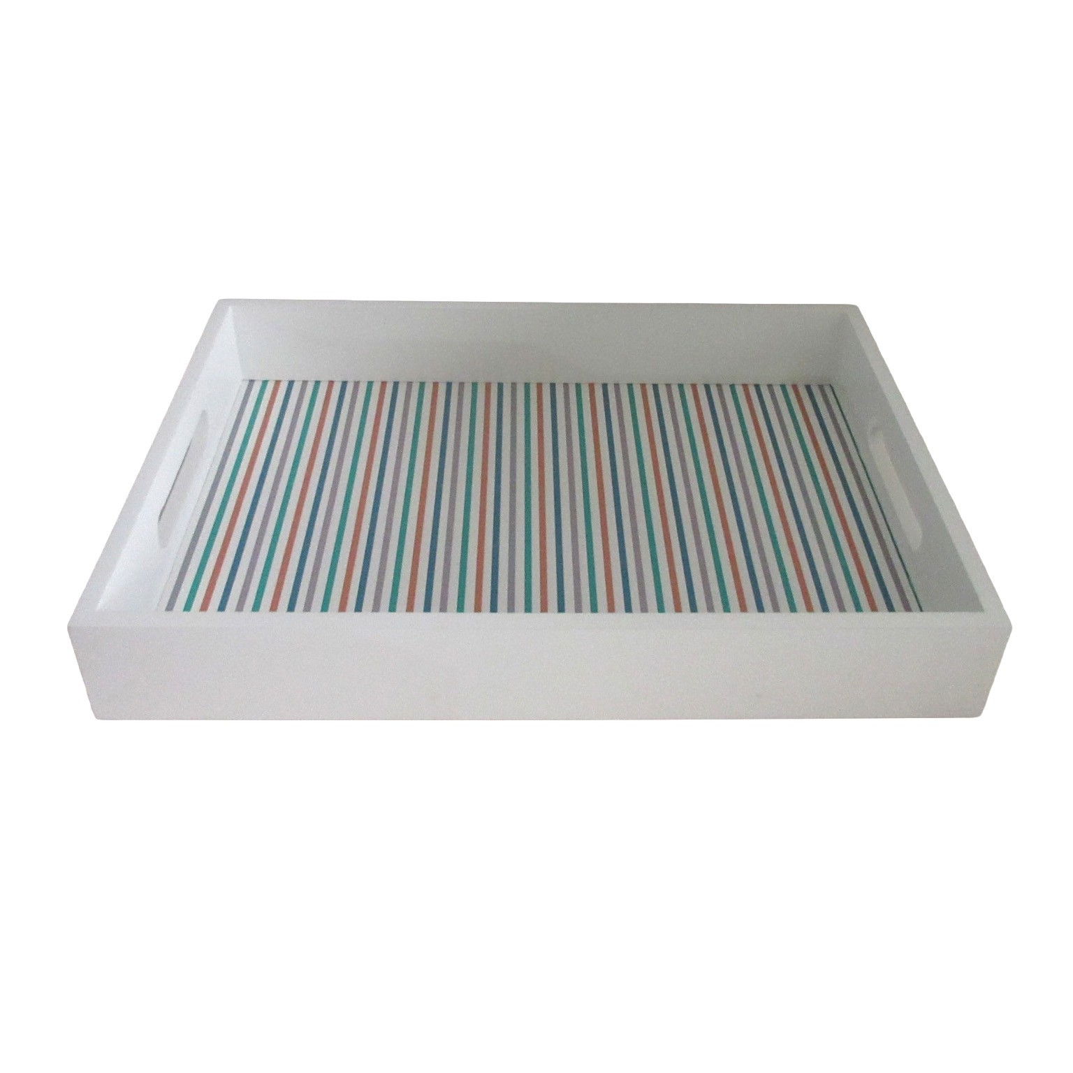Crafted from durable MDF wood, this modern tray features a vibrant striped design in shades of blue, red, and green against a white base.