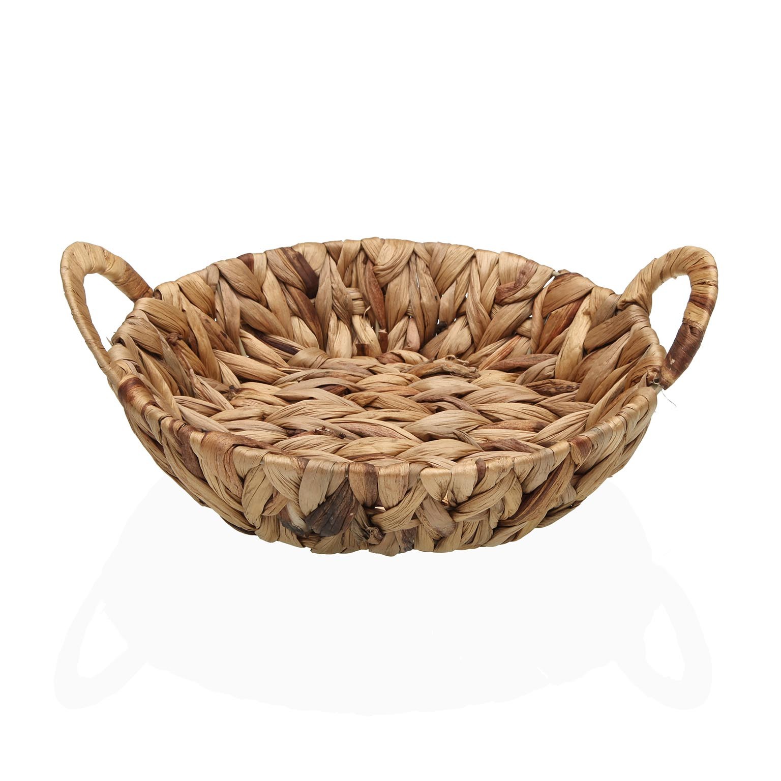 Enhance bathroom organization with this round basket featuring sturdy handles, crafted from sustainable hyacinth grass.