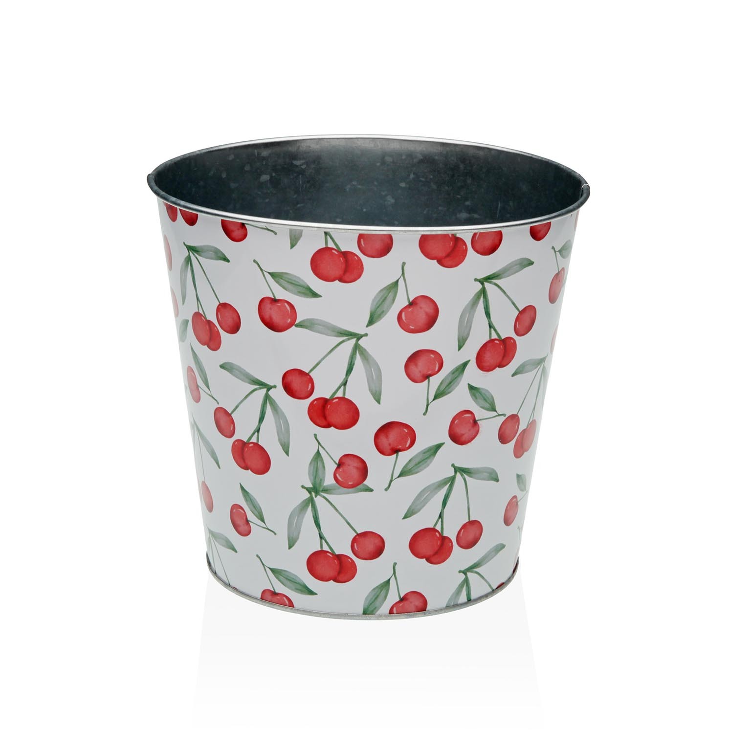 Measuring 16,5 cm in height and 17,5 cm in both width and length, this pot features a playful cherry design on a white background, accented by a metallic silver rim.