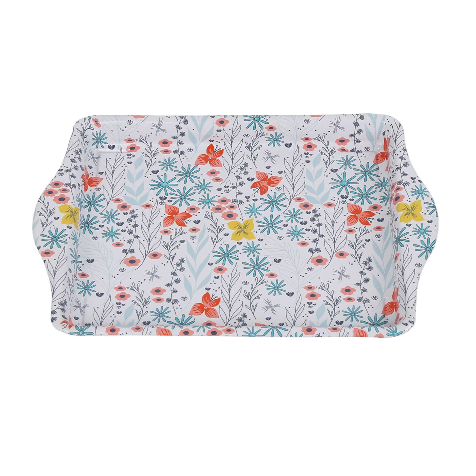 Crafted from durable metal and estaño, this modern platter features a vibrant floral design against a light blue background, making it a striking addition to any kitchenware collection.