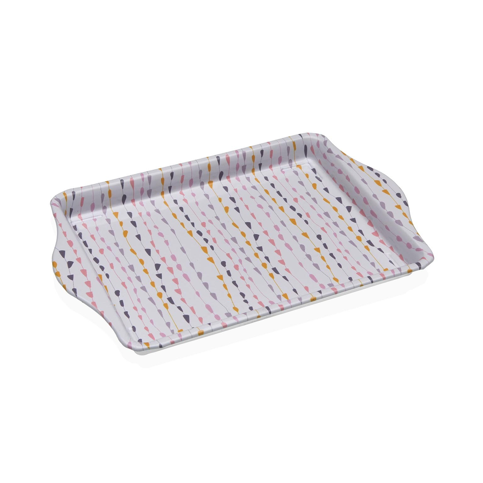 Crafted from durable metal, this contemporary platter features a playful design with a white base adorned in shades of pink, yellow, and gray.