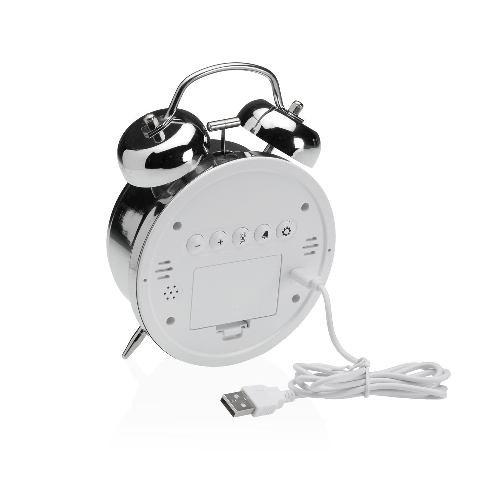 Crafted from durable metal, this alarm clock features a minimalist design with a striking silver finish, complemented by a clear digital display in white against a black background.