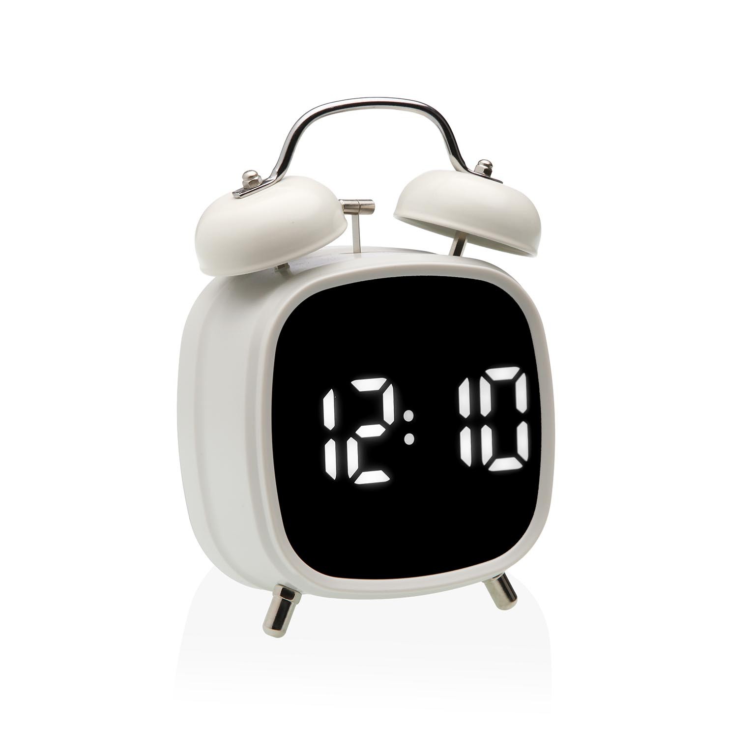 Enhance any space with this sleek white digital alarm clock, crafted from durable metal for a modern touch.